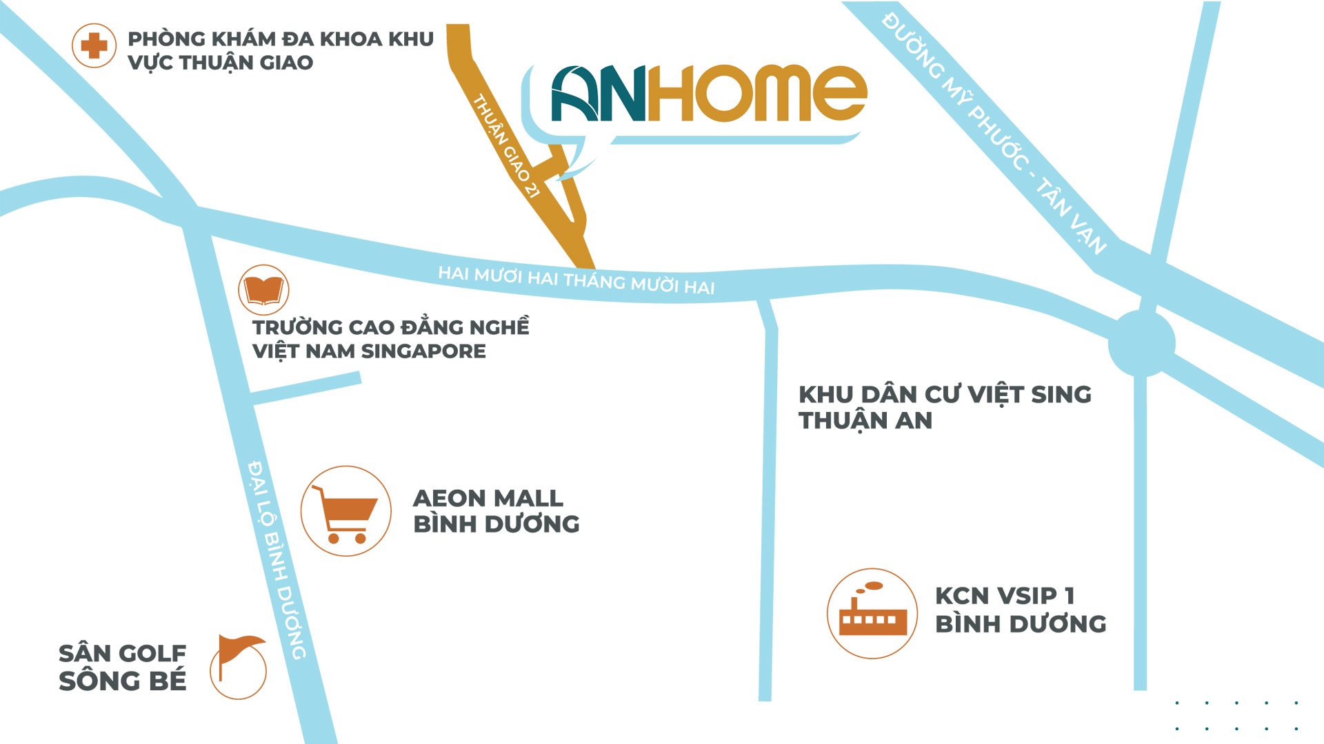 Đại lộ Bình dương và Cao tốc Mỹ Phước – Tân Vạn là 2 trục đường lớn nhất của Bình Dương và đóng vai trò xương sống xuyên suốt các huyện của Bình Dương đồng thời cũng kết nối với TP. HCM và các tỉnh lân cận. Ngoài ra, dự án AnHome Bình Dương còn gần với Aeon Mall Bình Dương, KCN VSIP 1, sân golf Sông Bé và Trường Cao Đẳng Nghề Việt Nam – Singapore.