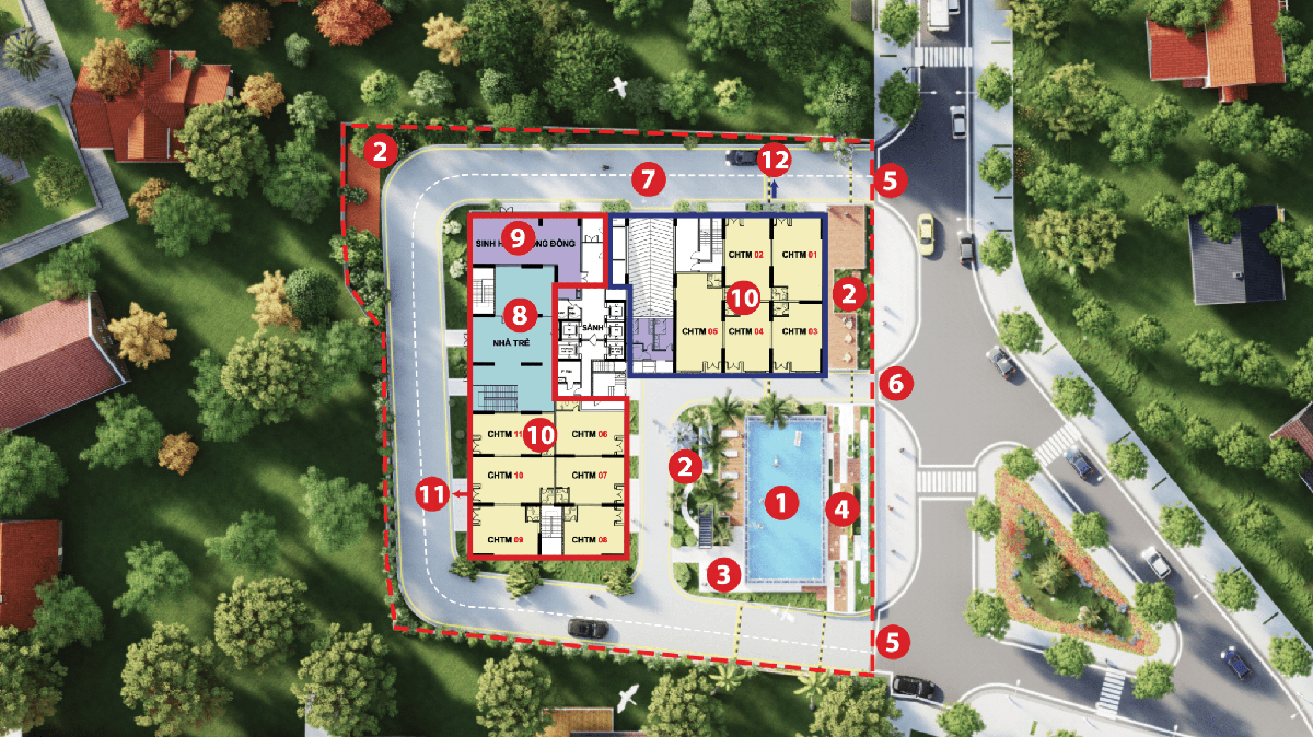 1. Hồ bơi người lớn, trẻ em 2. Sân vườn 3. Khu thể dục thể thao 4. Công viên 5. Lối vào chính 6. Lối vào phu 7. Lối lên xuống hầm 8. Nhà trẻ tầng 1 9. Nhà SHCĐ tầng 1 10. Shophouse 11. Nhà trẻ tầng 2 12. Nhà SHCĐ tầng 2.