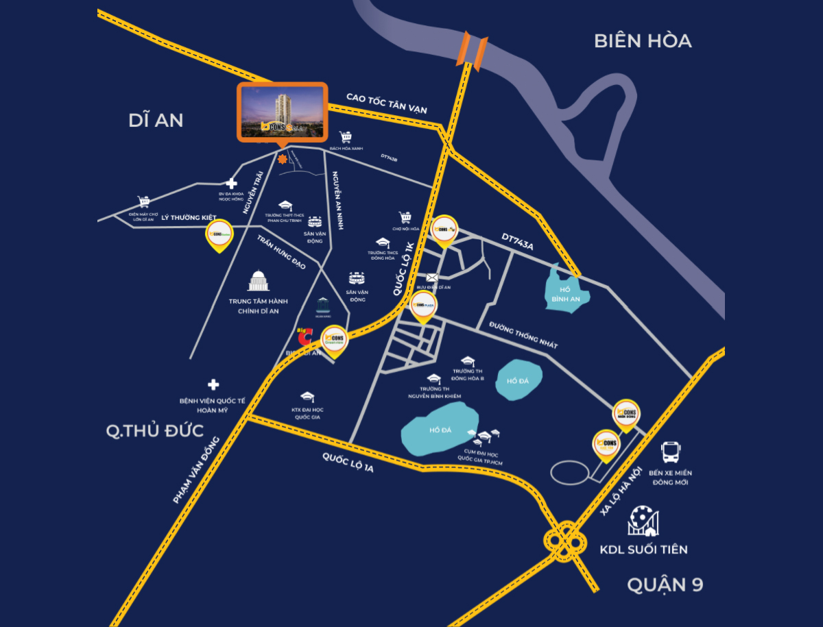 Với giao thông kết nối nhanh chóng nên khi so sánh thời gian di chuyển, người sinh sống ở trung tâm thành phố Dĩ An đi vào trung tâm TP.HCM còn nhanh hơn đi từ nhiều quận ngoại thành của Tp.HCM. Ngược lại, với các các tuyến đường lớn xung quanh dự án như quốc lộ 13, cao tốc Tân Vạn – Mỹ Phước… cư dân Bcons Sala hoàn toàn có thể đi đến các khu vực khác của Bình Dương một cách nhanh chóng.