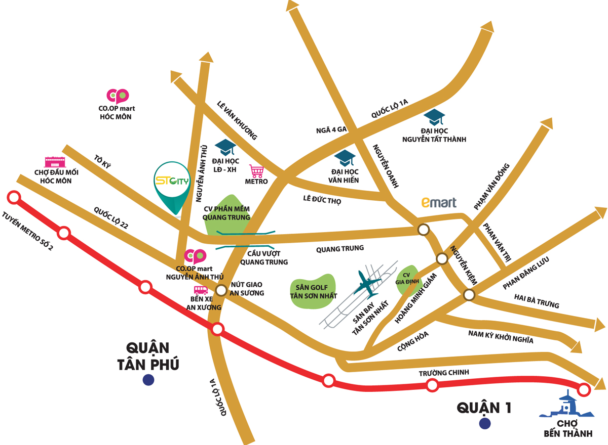 Chung cư STCity tọa lạc gần giao lộ Bùi Văn Ngữ – Nguyễn Ảnh Thủ, một tuyến đường sầm uất, nhộn nhịp và có vai trò quan trọng nhất tại Hóc Môn. Cùng với tuyến Tô Ký sẽ được mở rộng trong tương lai gần, STCity Hoc Mon chắc chắn sẽ trở thành đắc địa hơn bao giờ hết. STCity: