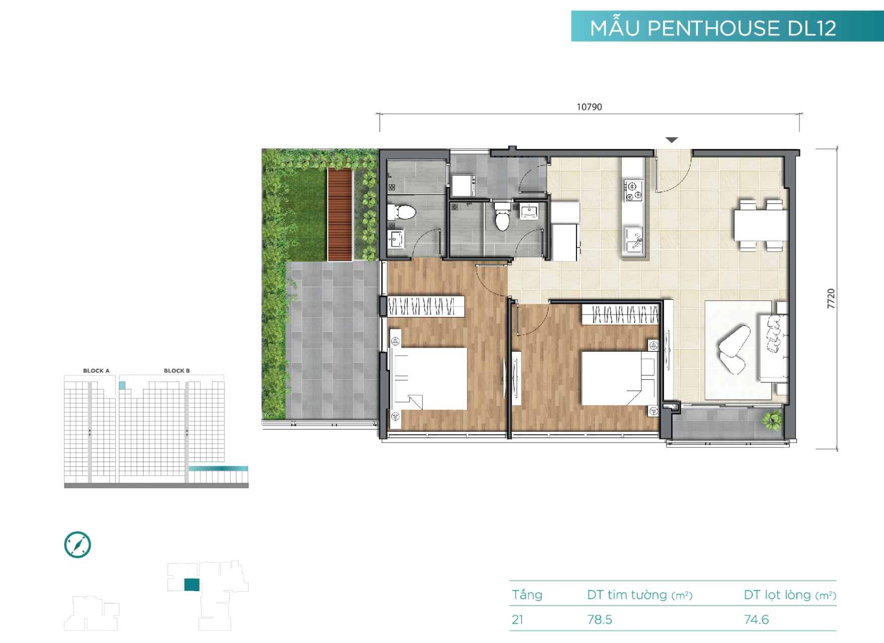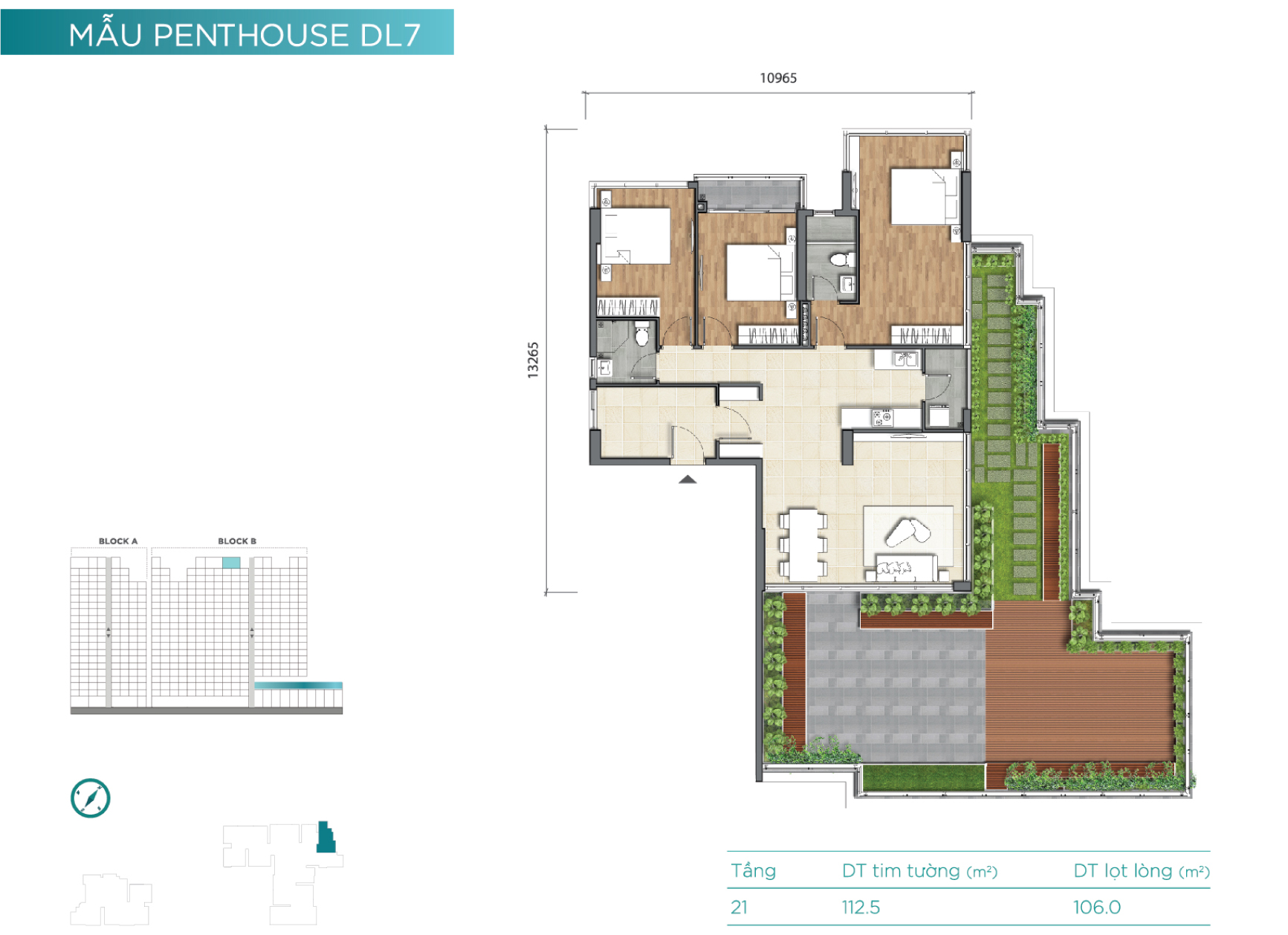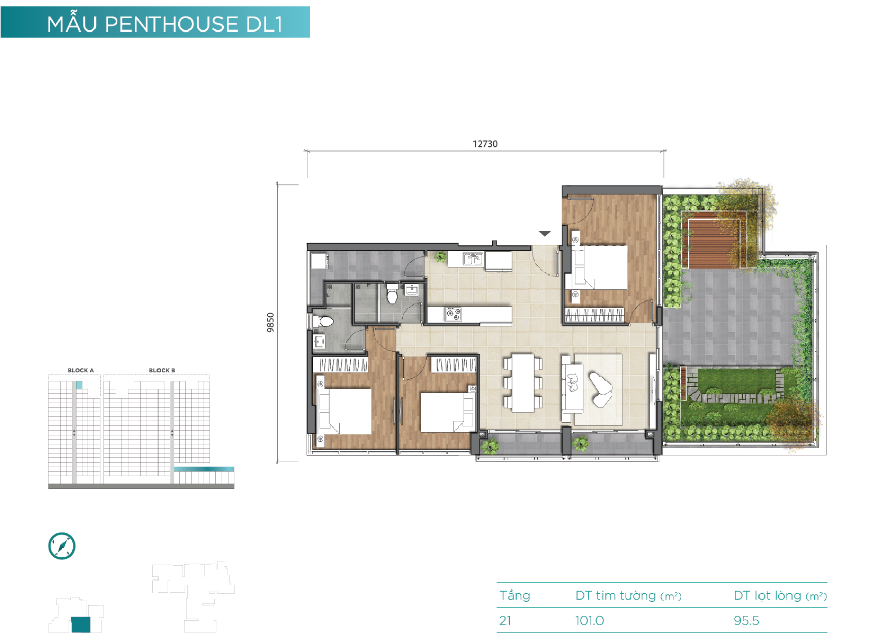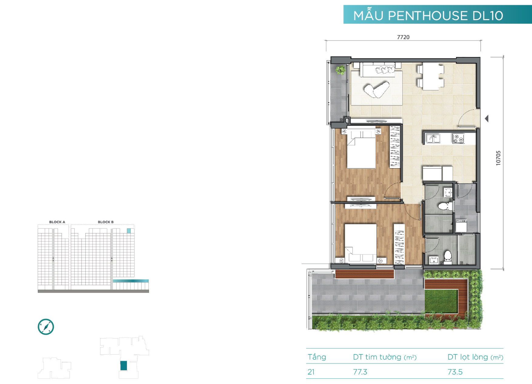 Tầng 21 là tầng căn hộ penthouse với mật độ xây dựng thấp và diện tích các căn hộ tương đối lớn. Đây cũng là những căn hộ dạng duplex và sở hữu rất nhiều không gian làm sân vườn cho “thượng khách”.
