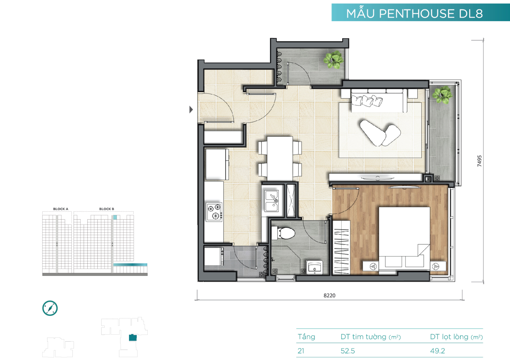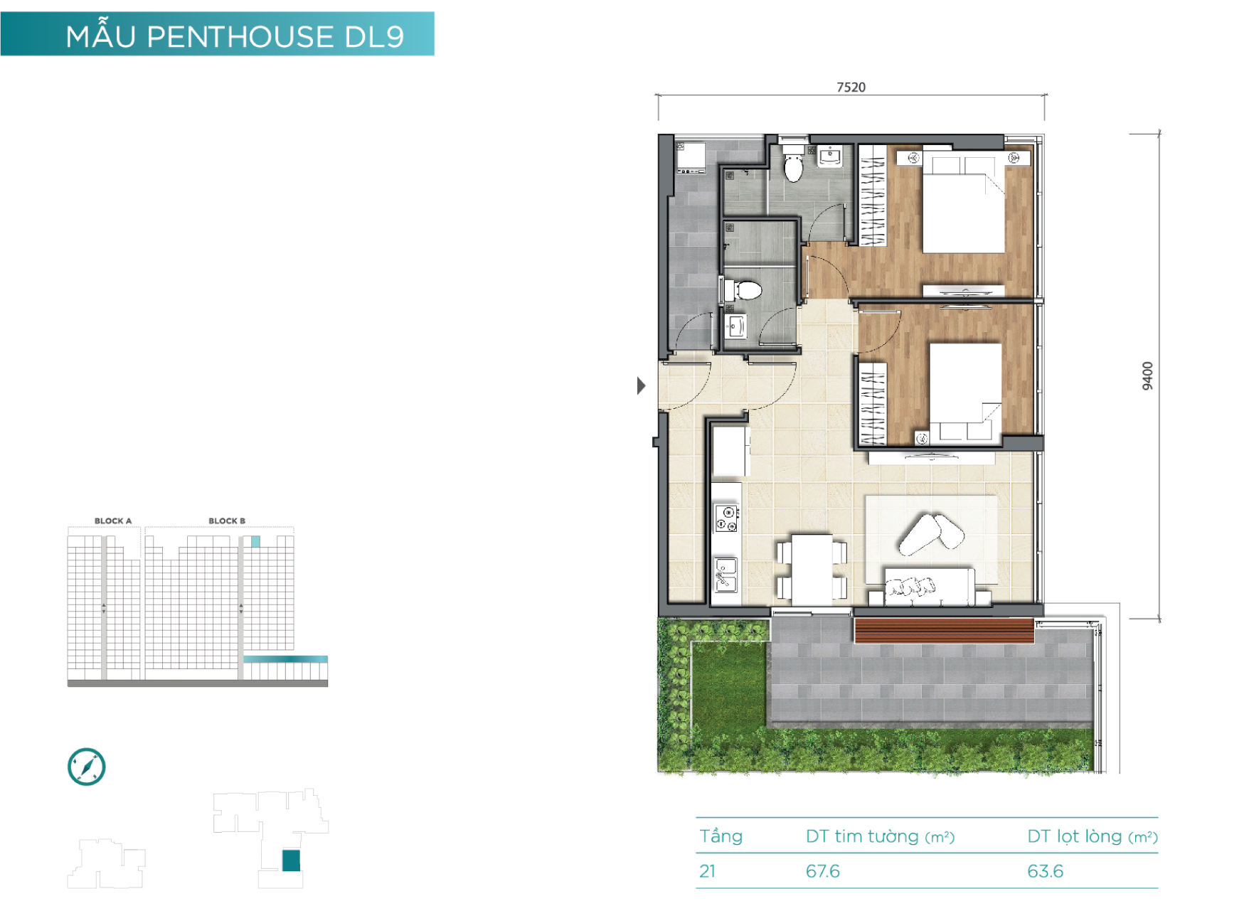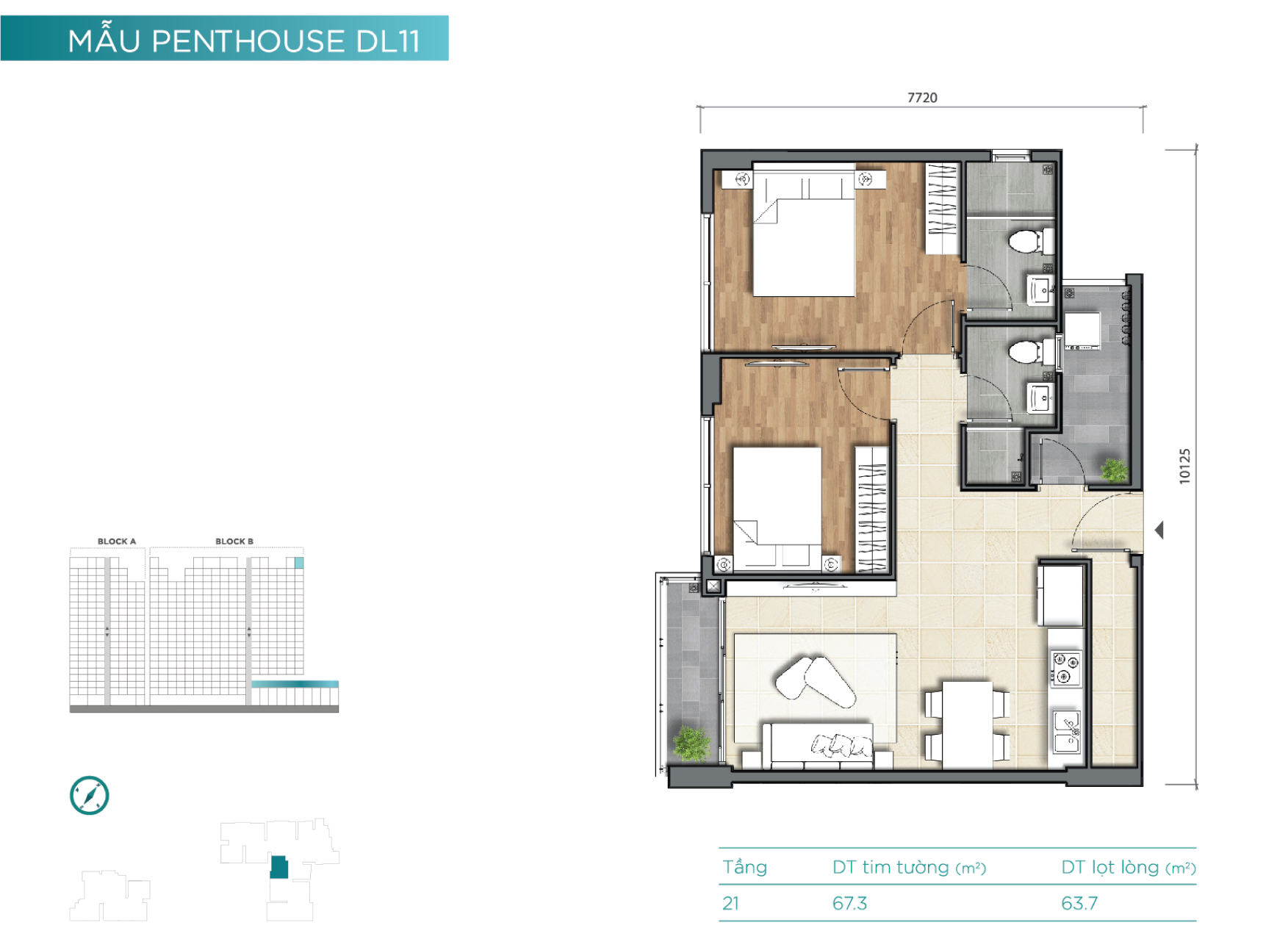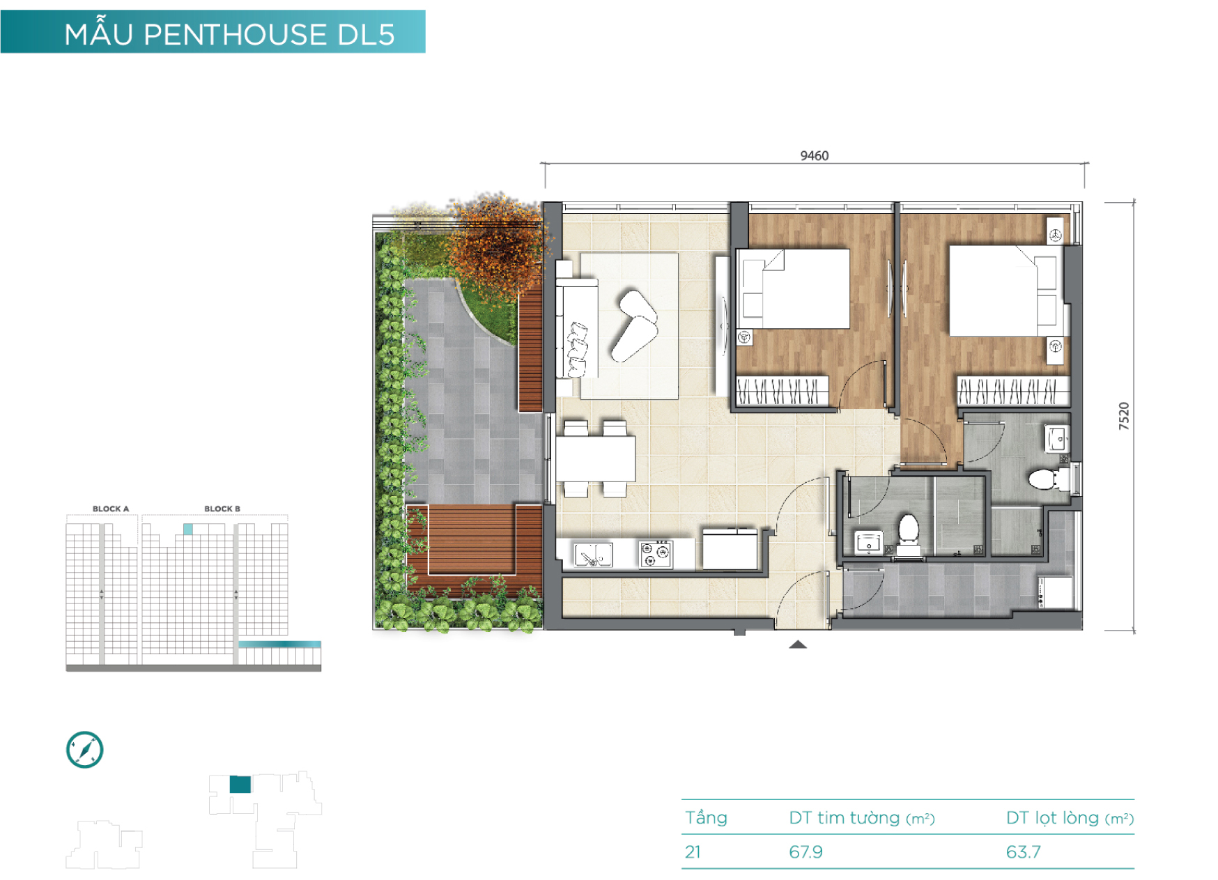 Tầng 21 là tầng căn hộ penthouse với mật độ xây dựng thấp và diện tích các căn hộ tương đối lớn. Đây cũng là những căn hộ dạng duplex và sở hữu rất nhiều không gian làm sân vườn cho “thượng khách”.