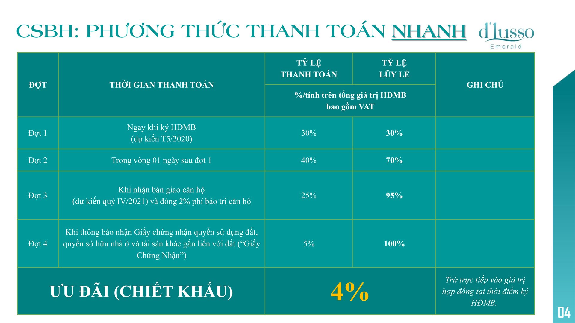 Ngoài ra, đối với khách hàng mua sỉ căn hộ D’lusso Emerald quận 2 còn được nhận thêm tỷ lệ chiết khấu 2% trên tổng giá trị sản phẩm nếu mua từ 2 – 3 căn; 3% nếu mua từ 4 – 5 căn và 5% nếu mua 6 căn trở lên.