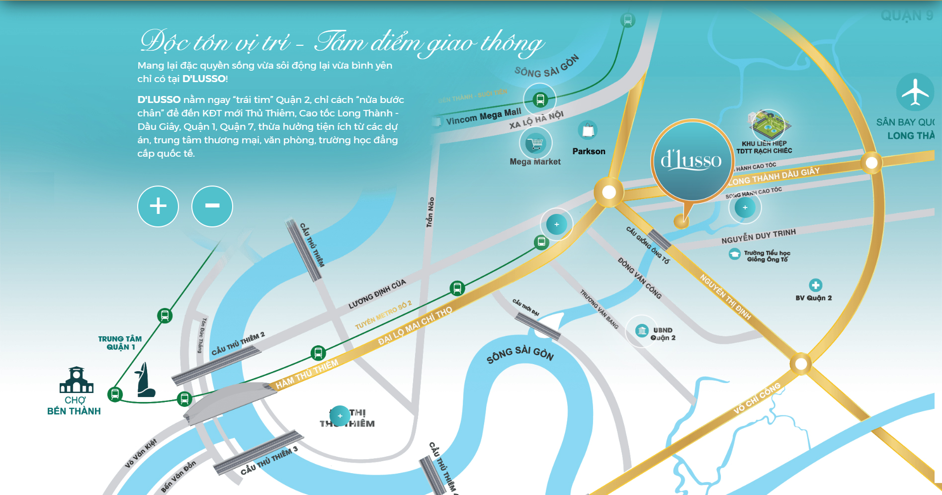 Ngoài ra, Du an D’lusso sở hữu vị trí trắc địa ngay đầu đường Cao Tốc Long Thành – Dầu Giây; nút giao thông An Phú; Từ vị trí này dự án, bạn có thể di chuyển nhanh chóng đến khu vực trung tâm thành phố qua các tuyến đường như: