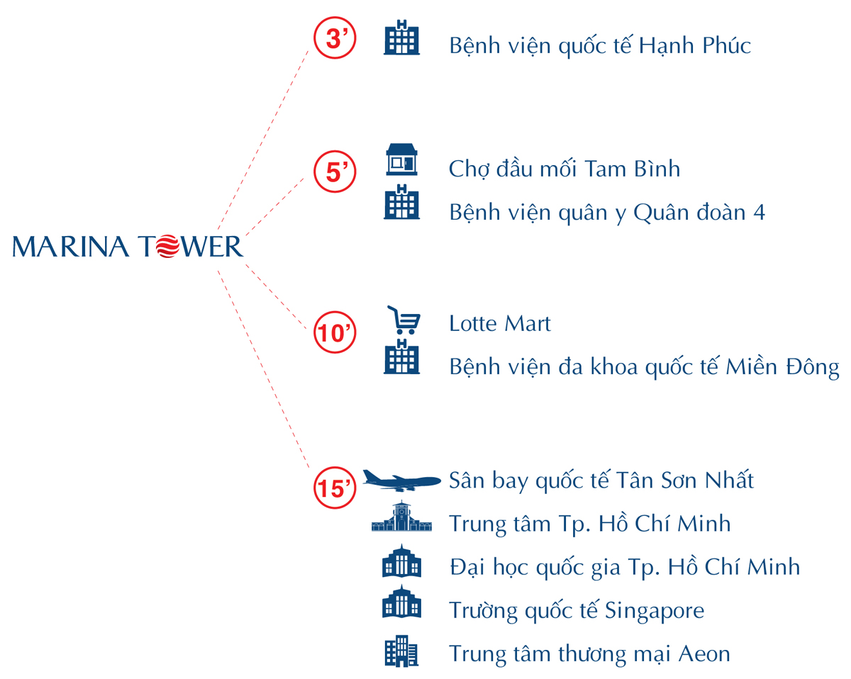Căn hộ Marina Tower tọa lạc ngay Quôc Lộ 13, cách Ngã tư Bình Phước 1,5km, cách cổng chào Bình Dương  chỉ 1km.  Từ Marina Tower đến hàng loạt địa chỉ quan trọng như: bệnh viện Hạnh Phúc, trung tâm thương mại Aeon, Bệnh viện Đa Khoa, Bệnh việc Quốc tế Columbia, Trường Quôc Tế Singapore, Lotte Mart… chỉ với bán kính dưới 2km.