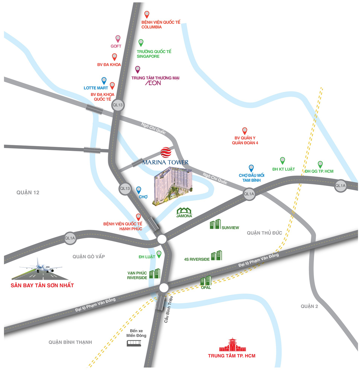 Căn hộ Marina Tower Bình Dương do công ty Đại Thịnh Phát làm chủ đầu tư với sự góp vốn của LDG tiếp giáp với Quận Thủ Đức với trục đường xương sống là Quốc Lộ 13 nên vô cùng thuận tiện di chuyển về Chợ Nông sản Tam Bình, Bến xe Miền Đông và ngay cả Quận 1.
