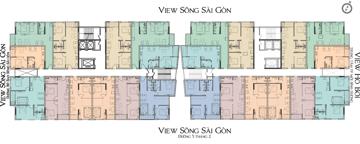 Mỗi tầng Vista Riverside có 24 căn hộ từ 1 phòng ngủ đến 2 phòng ngủ có diện tích từ 39 m2 đến 63 m2. Vista Riverside Bình Dương có thiết kế rất thông thoáng, bất cứ căn hộ nào cũng có khoảng không kế bên để thu hút nắng – gió tự nhiên vào căn hộ. Mỗi block Vista Riversdie có 2 thang bộ, 3 thang máy trong đó có 1 thang vận chuyển.
