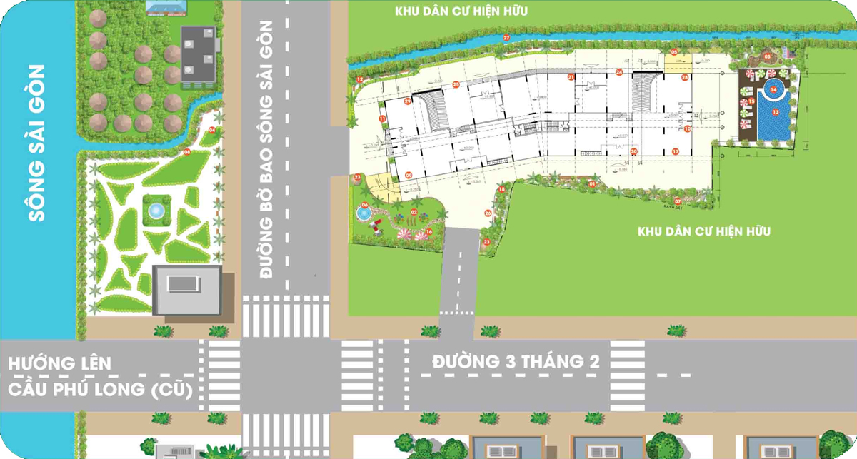 1. Khu vui chơi mùa xuân | 2. Khu vui chơi trẻ em | 3. Vườn nướng BBQ | 4. Công viên ven sông | 5. Vườn hoa theo mùa | 6. Đài Phun nước | 7. Công viên mùa hạ | 8. Đường chạy bộ | 9. Cửa hàng tiện ích | 10. Cafe Terrace | 11. Tiểu cảnh vào sảnh | 12. Vườn cảm hứng | 13. Hồ bơi tràn | 14. Hồ bơi trẻ em | 15. Ghế thư giản | 16. Khu vực chờ | 17. Shophouse | 18. Công viên chủ đề