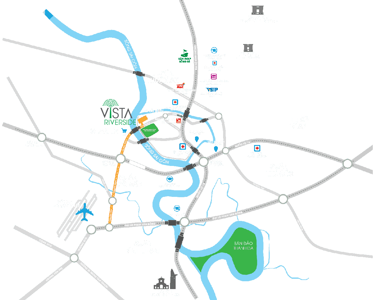 Dự án Vista Riverside tọa lạc mặt tiền đường 3 Tháng 2 và Bờ Bao sông Sài Gòn thuộc thị trấn Lái Thiêu, huyện Thuận An, tỉnh Bình Dương, chỉ cách Hà Huy Giáp Quận 12 bởi cây cầu sắt. Vista Riverside Thuận An là của ngỏ phía Bắc Sài Gòn, nơi dễ dàng kết nối với: