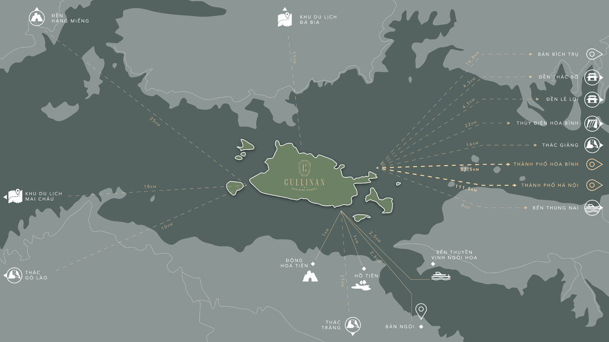 Cullinan Hòa Bình là một khu nghỉ dưỡng riêng tư và sang trọng, tách mình khỏi đô thị ồn ã, ẩn sâu trong rừng già Tây Bắc, giữa lòng hồ Hoà Bình mênh mang sóng nước. Hoà hợp với thiên nhiên, hiện hữu trong dòng chảy lịch sử, dần bồi đắp nên tuyệt tác.