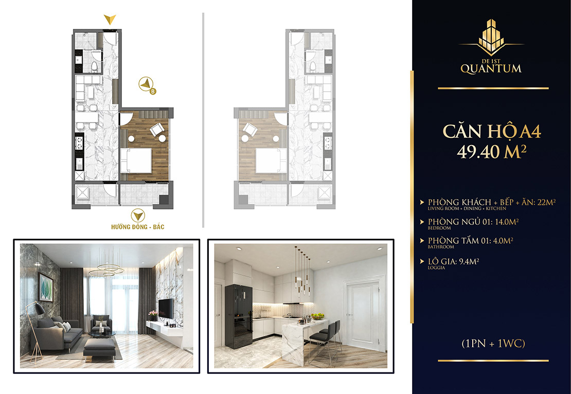 De 1st Quantum có tất cả 10 loại căn hộ: A1, A2, A3, A4, B1, B2, B3, B4, B5, B6. Xu hướng chung trong cách thiết kế của căn hộ De 1st Quantum là diện tích tương đối nhỏ, chỉ có lô gia (không có ban công – ngoại trừ căn hộ sân vườn tầng 3) nhưng bố trí rất hợp lý nên vẫn tạo sự thông thoáng.