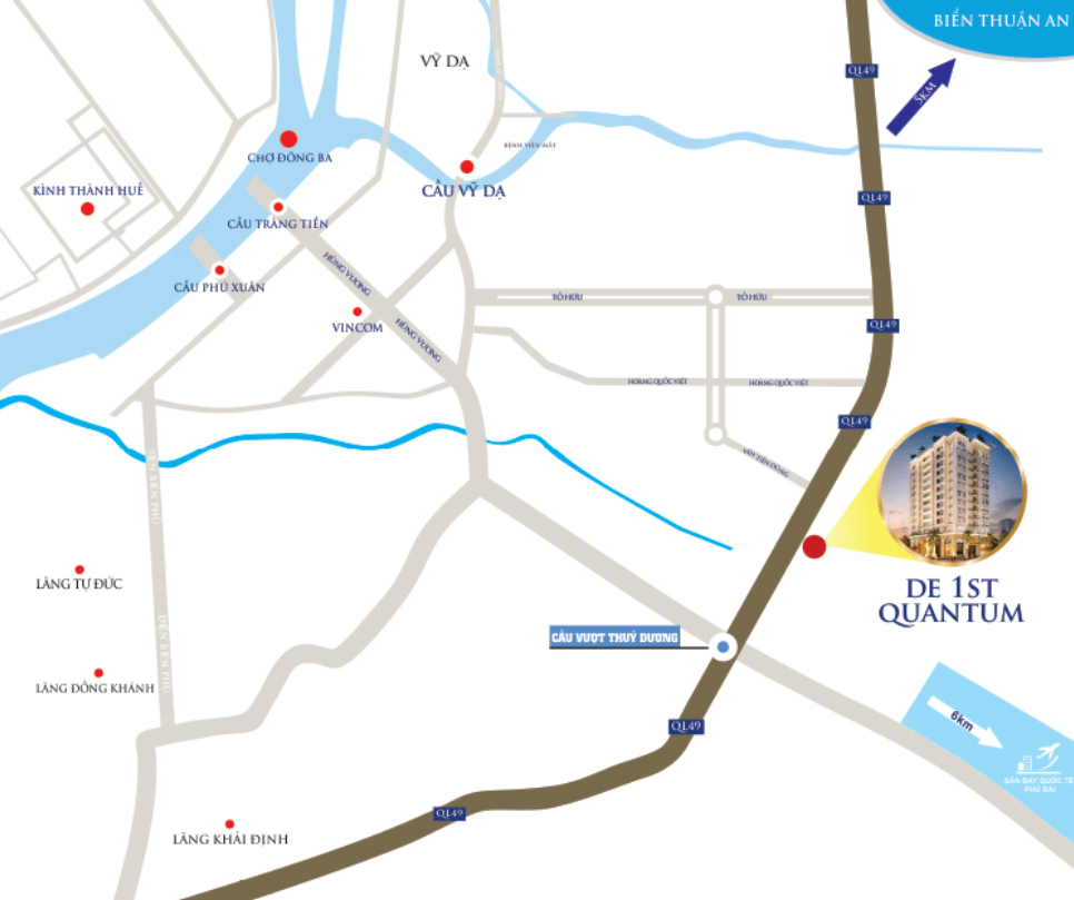 Chung cư De 1st Quantum nằm trong khu đô thị mới của thành phố Huế, mặt tiền Quốc Lộ 49, thuộc phường Thủy Dương, thị xã Hương Thủy, tỉnh Thừa Thiên Huế.