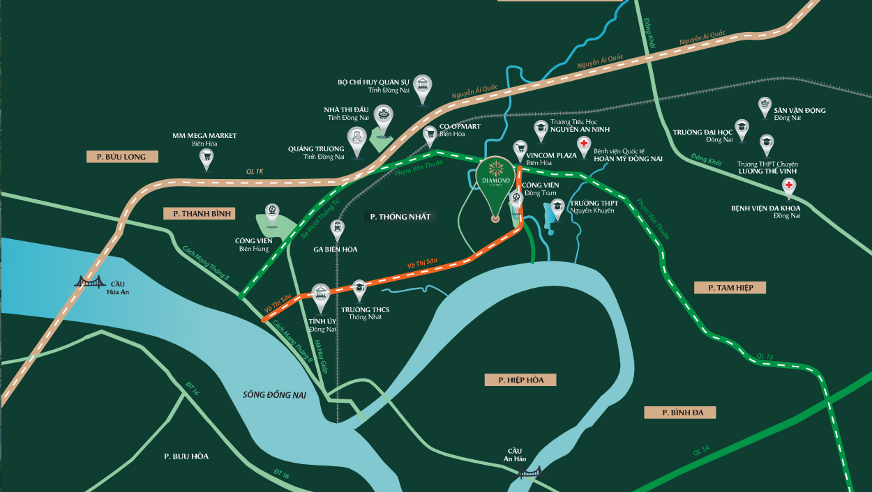 Đây là dự án thứ 2 trong số 3 dự án mang thương hiệu “Diamond” được triển khai ngay mặt tiền đường Võ Thị Sáu, thành phố Biên Hòa. Tham khảo: Diamond Central và Diamond Metropole.