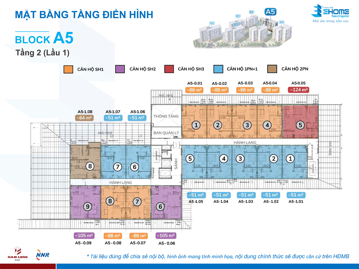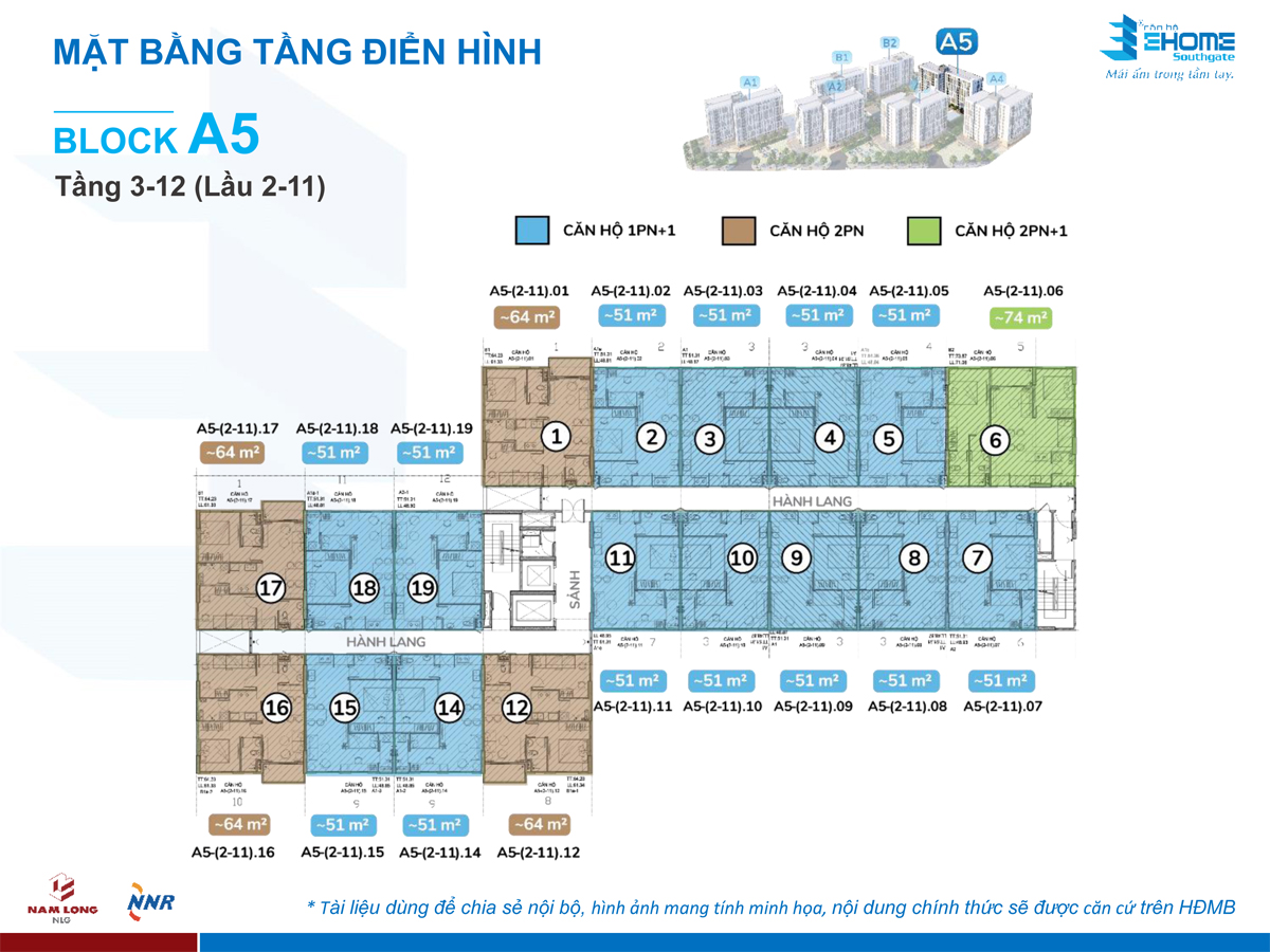Mỗi tầng căn hộ Ehome Southgate Long An chỉ có 19 căn trong đó có 13 căn diện tích từ 51 m² (1PN 1WC), 4 căn có diện tích 64 m² (1PN 2WC + ban công) và 1 căn 75 m² (2PN 2WC). Block A5 có 2 thang bộ và 2 thang máy trong đó có 1 thang tải.