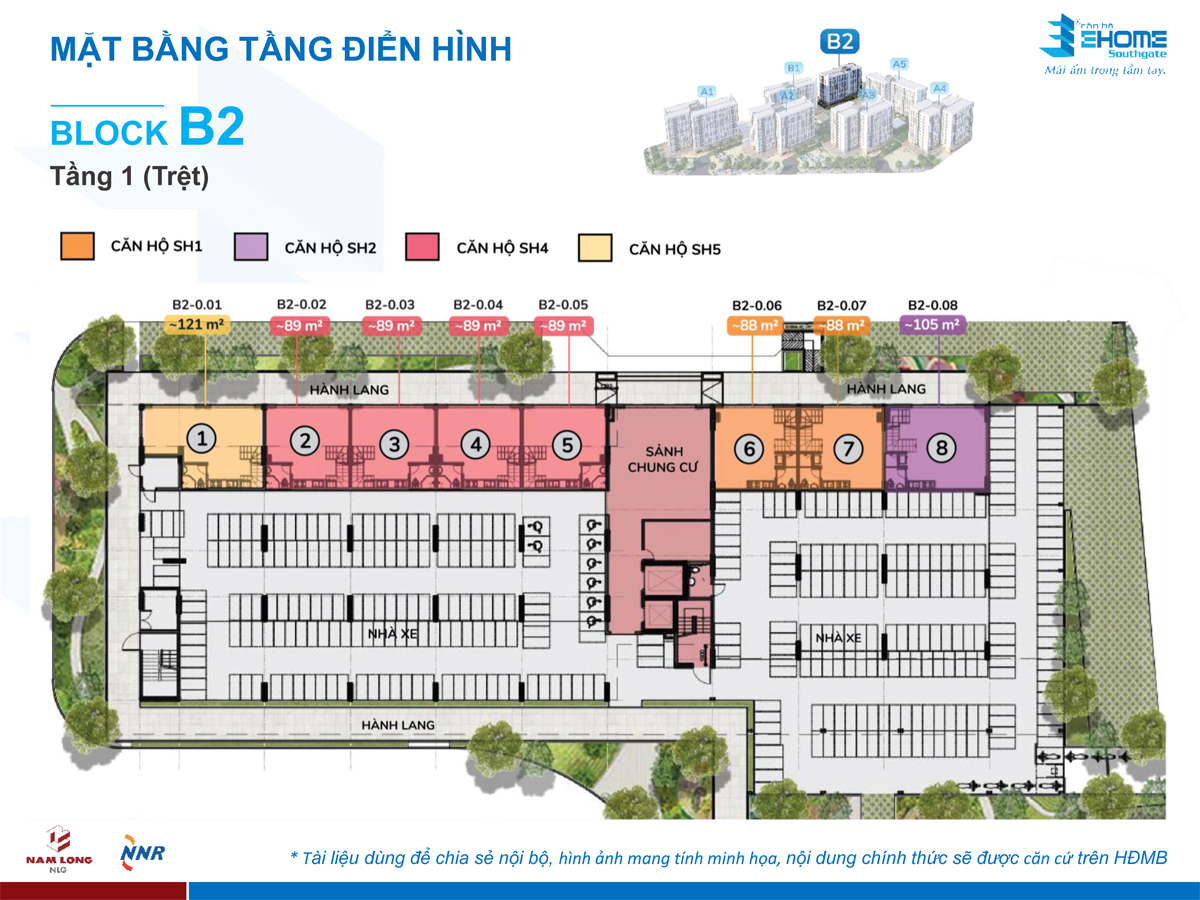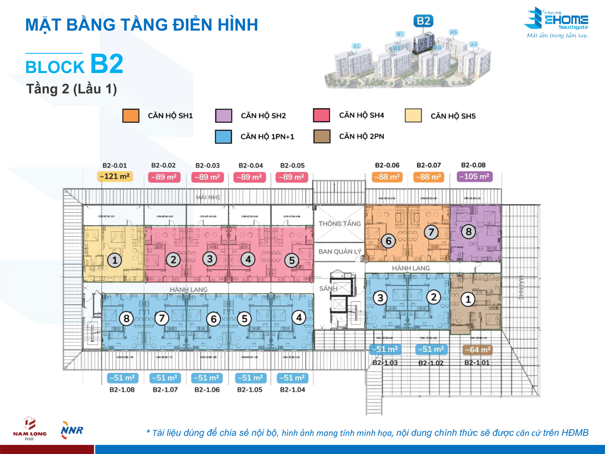 Tương tự như Block A5 về các thông số nhưng Block B2 có ít hơn 3 hộ. Cả 2 block đều có thiết kế vuông vức, có sân phơi. Bên ngoài các căn hộ EHome Southgate có hàng làng rộng và đối lưu không khí tốt.
