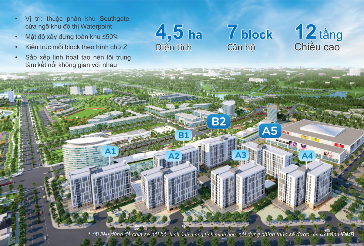 Tổng thể khu chung cư EHome Southgate bao gồm 7 block: A1, A2, A3, A4, A5 và B1, B2. 7 block có chiều cao 12 tầng, xung quanh là các cổng vào/ra khu đỗ xe tạm, bên trong 7 khối tháp là các tiện ích nội khu của dự án. Trong số 7 block, block B2 và A5 sẽ được mở bán trước.