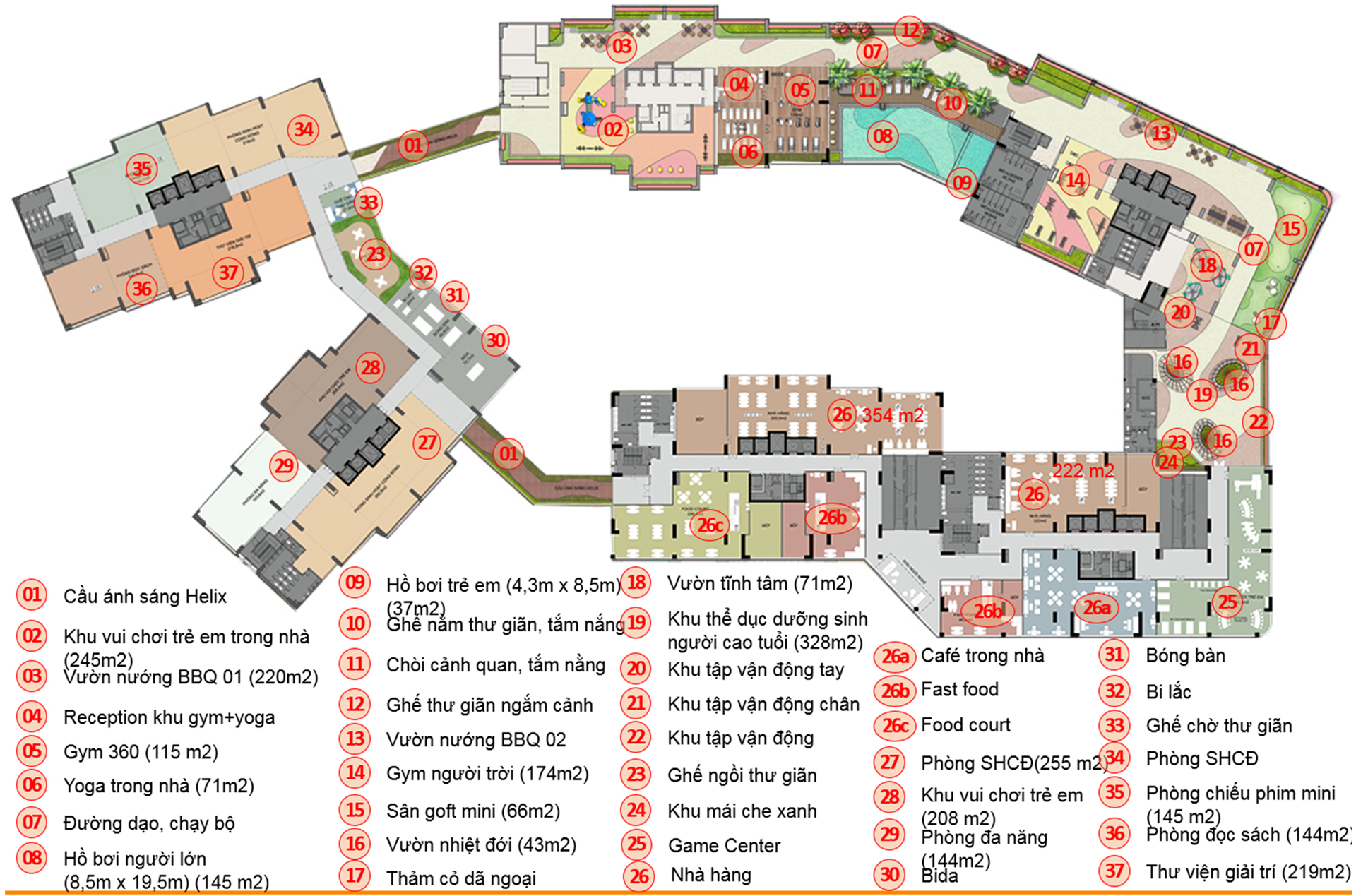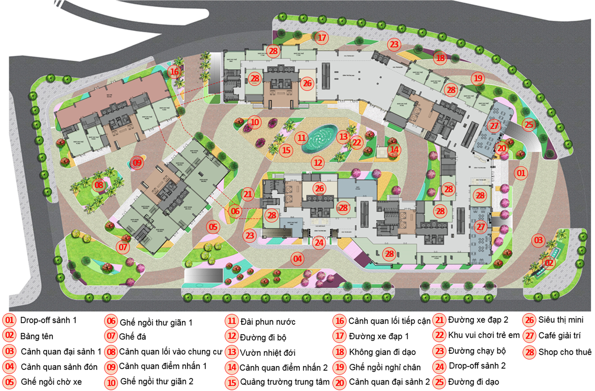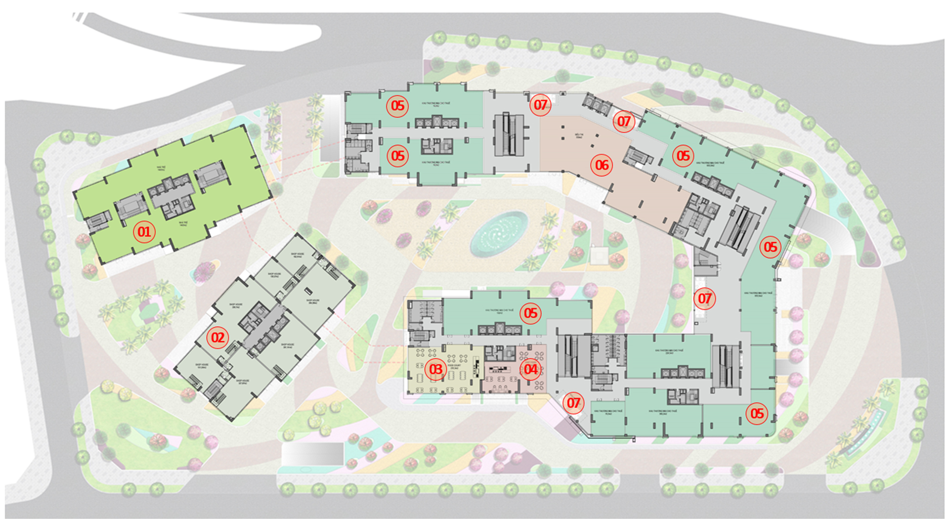 1. Nhà Trẻ | 2. Shophouse | 3. Fast Foood | 4. Food Court | 5. Khu thương mại cho thuê | 6. Siêu thị | 7. Khu ngồi nghỉ.