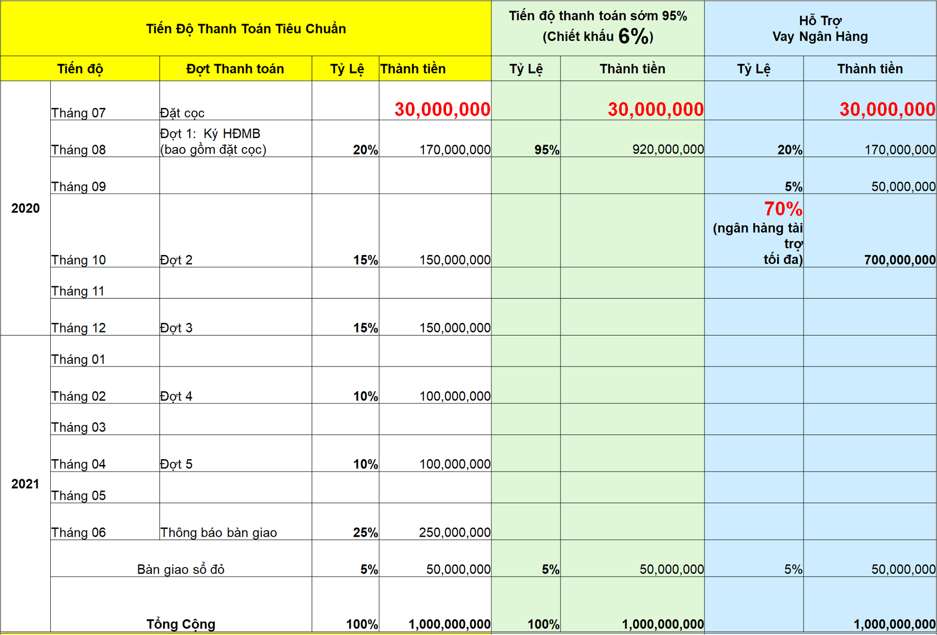 + Khách hàng thanh toán 95% tổng giá trị căn hộ sẽ được chủ đầu tư chiết khấu 6% trên tổng giá trị căn hộ (chưa thuế VAT). Mức chiết khấu này sẽ được trừ trực tiếp vào giá thành căn hộ.