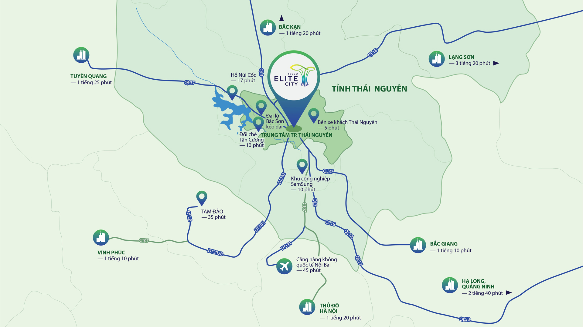 Bản đồ sau cho chúng ta cái nhìn tổng quan về liên kết vùng của Tỉnh Thái Nguyên và các tỉnh lân cận, trong đó Elite City thành phố Thái Nguyên là hạt nhân với những kết nối vô cùng thuận tiện đến các vùng miền khác nhau.
