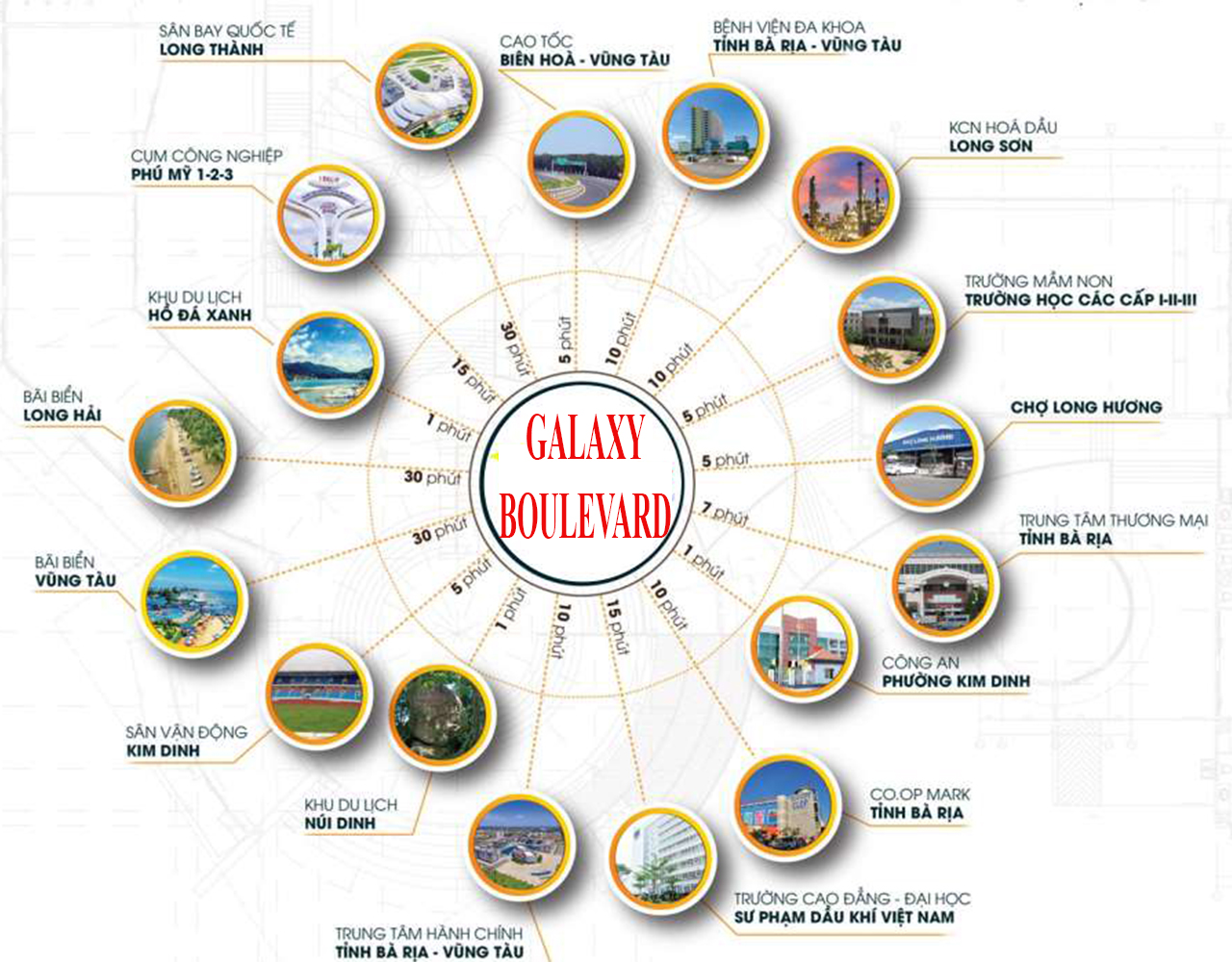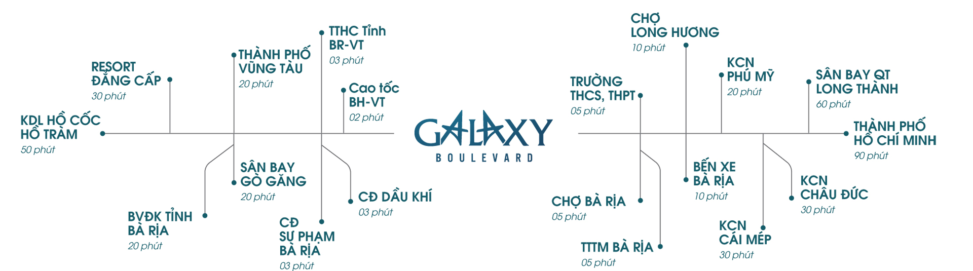 Dự án Galaxy Boulevard Bà Rịa Vũng Tàu sở hữu hệ thống các tiện ích ngoại khu dày đặc và chất lượng trong một khoảng cách di chuyển tối đa chỉ 30 phút. Những tiện ích – dịch vụ mà cư dân Galaxy Boulevard sử dụng hằng ngày chỉ cách đó một quãng di chuyển ngắn như: Chợ Long Hưng, Trung tâm hành chính, Co.op Mart Bà Rịa, Bệnh viện Đa khoa Bà Rịa Vũng Tàu, hệ thống trường học các cấp…