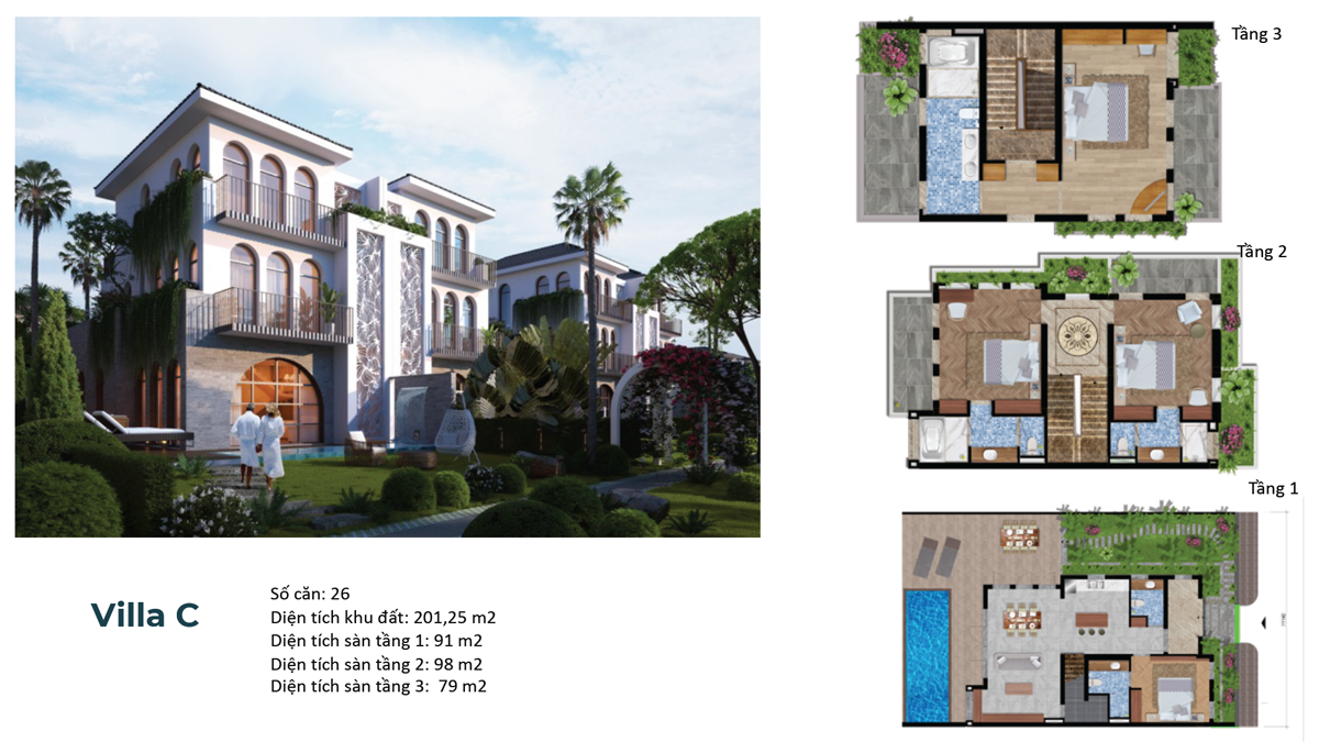 + Diện tích tầng trệt: 91 m², diện tích tầng 1: 98 m², diện tích tầng 2: 79 m²