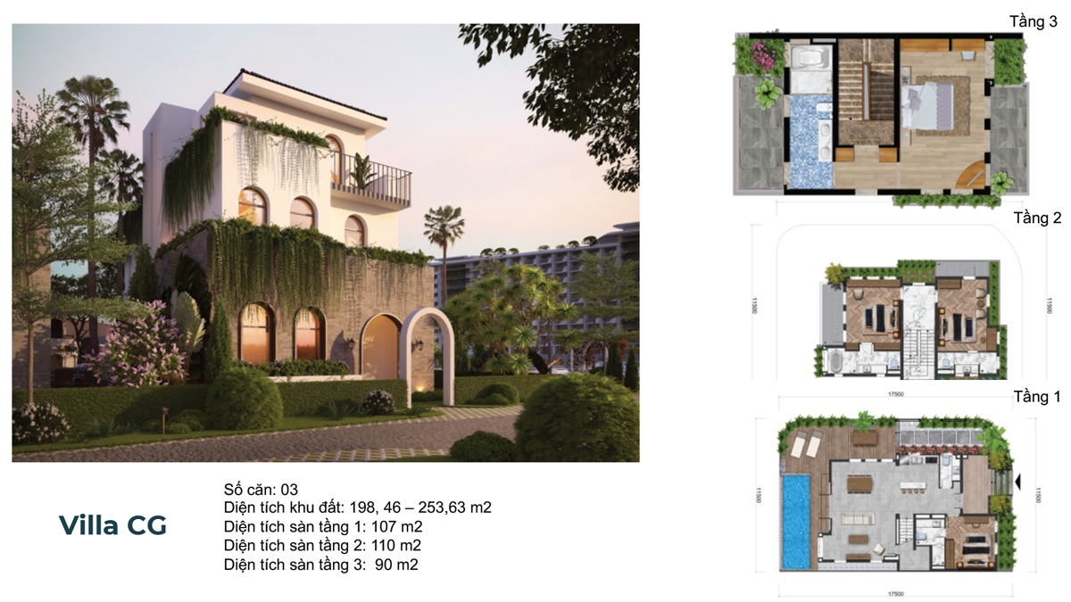 + Diện tích tầng trệt: 107 m², diện tích tầng 1: 110 m², diện tích tầng 2: 90 m²
