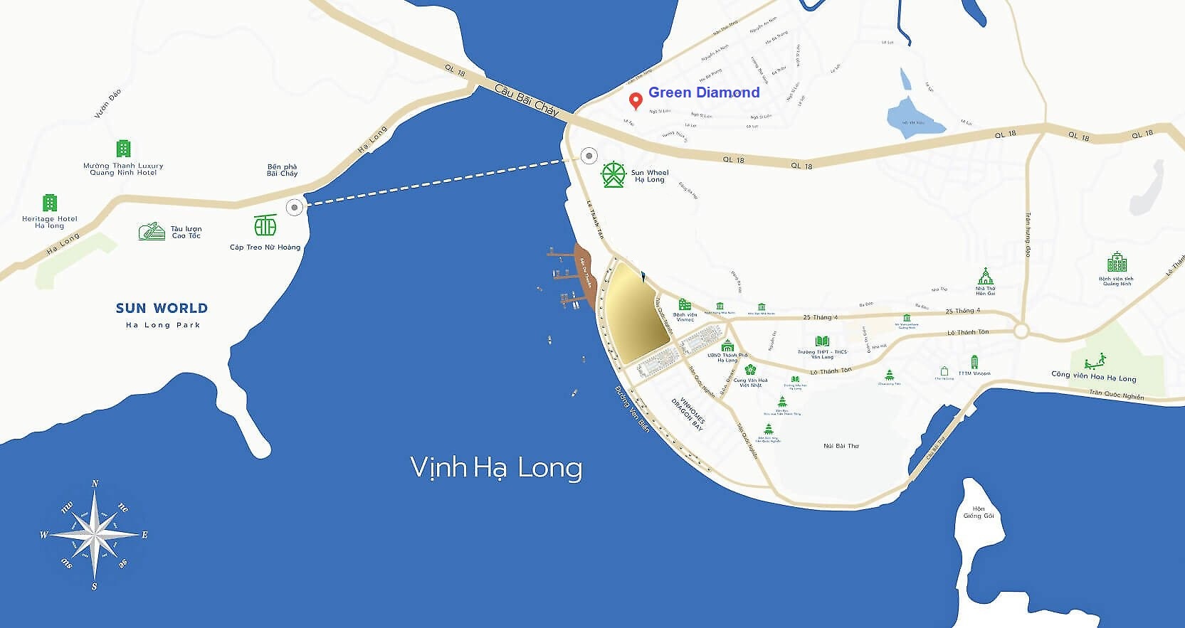 Đây cũng là khu vực có mật độ dân cư đông đúc với nhiều tiện ích ngoại khu đầy đủ, nơi tập trung nhiều khu vui chơi giải trí, nhà hàng ăn uống từ bình dân đến cao cấp. Ngoài ra, khu dự án căn hộ Green Diamond chỉ cách Cầu Bãi Cháy, khu vui chơi Hạ Long View, Chợ Hạ Long, trung tâm thương mại Vincom và bệnh viện đa khoa quốc tế Vinmec khoảng trên dưới 1 km.