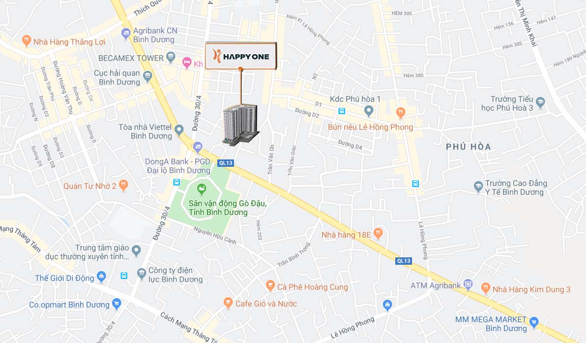 Dự án Happy One Thủ Dầu Một tọa lạc tại số 113 đường 30/4 thuộc phường Phú Hòa, thành phố Thủ Dầu Một, tỉnh Bình Dương.