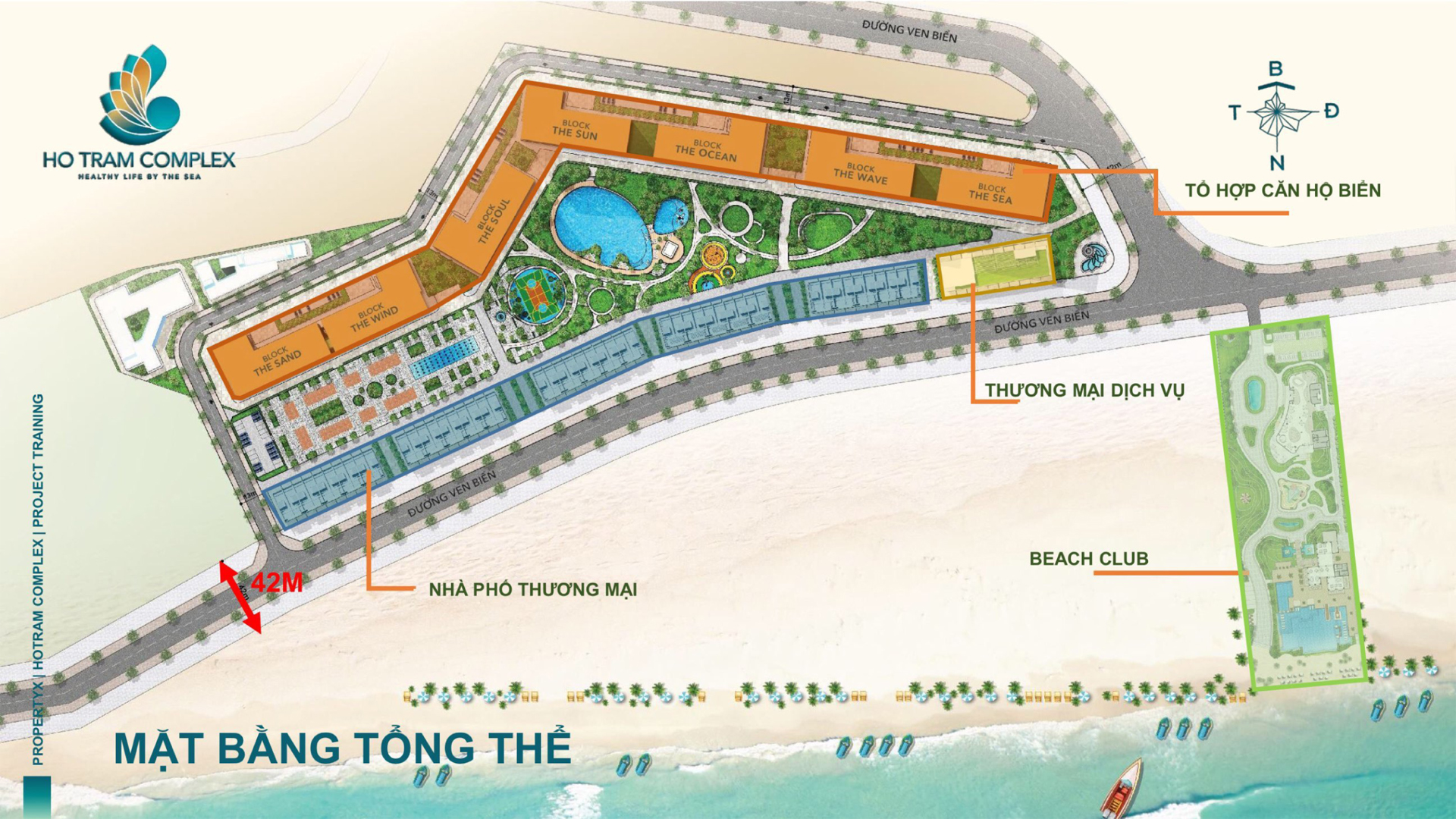 Về tổng thể, Hồ Tràm Complex là dự án giáp biển, sở hữu mặt tiền biển trong đó khu vực dành cho khu vui du lich biển. Các căn hộ chung cư Hồ Tràm Complex không bị chắn tầm nhìn, view biển đẹp nhất. Phía sau khu du lịch biển là các nhà phố thương mại (shophouse) và sau nữa là các tiện ích nội khu và phía trong cùng dành cho 7 block căn hộ chung cư.