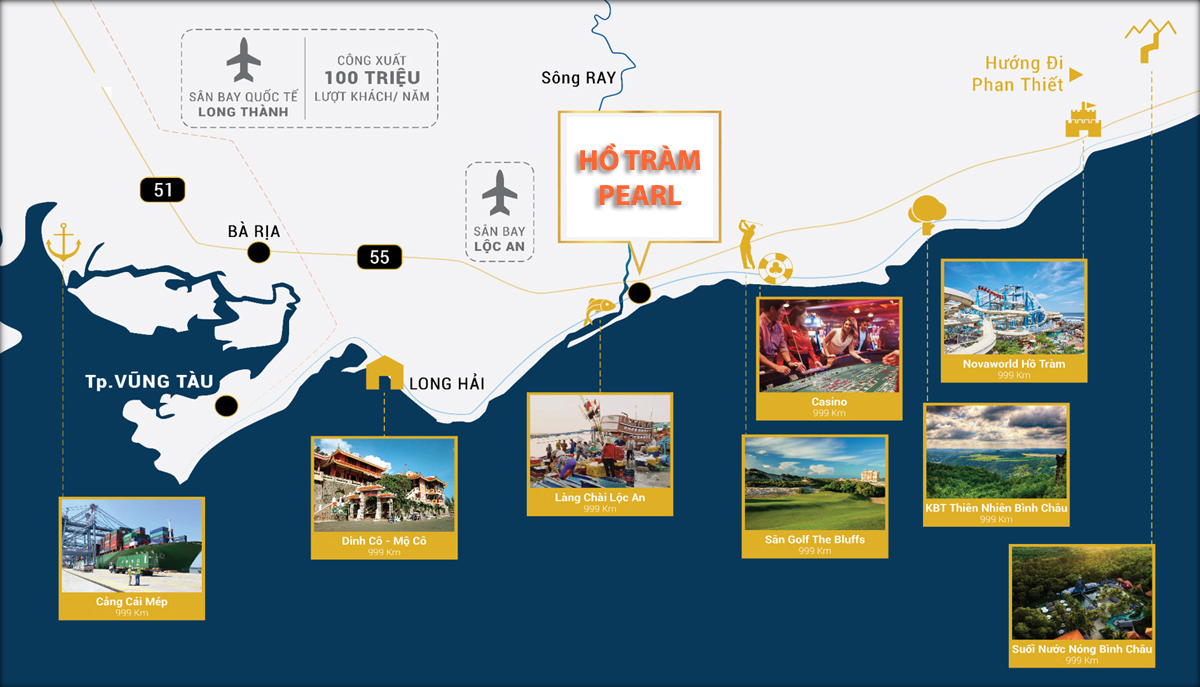 Đến với khu villa Hồ Tràm Complex, chúng ta chỉ mất 90 phút di chuyển bằng ô tô từ thành phố Hồ Chí Minh hoặc chỉ 60 phút từ sân bay Long Thành. Điều này rất dễ biến những căn hộ, căn biệt thự Hồ Tràm Pearl thành ngôi nhà thứ hai hay “ngôi nhà nghỉ dưỡng” của các đại gia xứ Sài Thành.