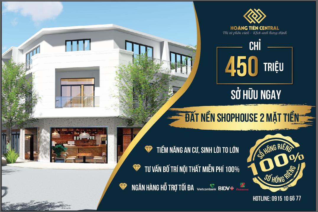 Hoàng Tiến Central là dự án đất nền shophouse với điểm đặc biệt là 2/3 số lô đất sở hữu hai mặt tiền nên rất thuận tiện trong việc buôn bán và kinh doanh. Các lô đất nền shophouse Hoàng Tiến Central có diện tích từ 60m² đến 113m² với sổ đỏ riêng từng nền.