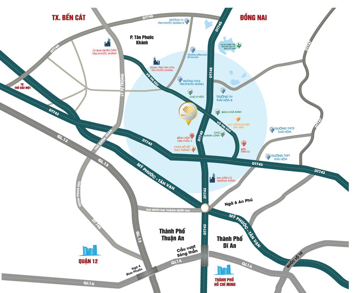 Bao quanh dự án Hoàng Tiến Central Tân Uyên là hàng loạt các tuyến đường huyết mạch đã và đang triển khai như cao tốc Mỹ Phước Tân Vạn, Vành Đai 4, ĐT 745, ĐT 746, ĐT 743, ĐT 743B giúp kết nối 3 vùng Thủ Dầu Một – TP. HCM và tỉnh Đồng Nai với nhau.