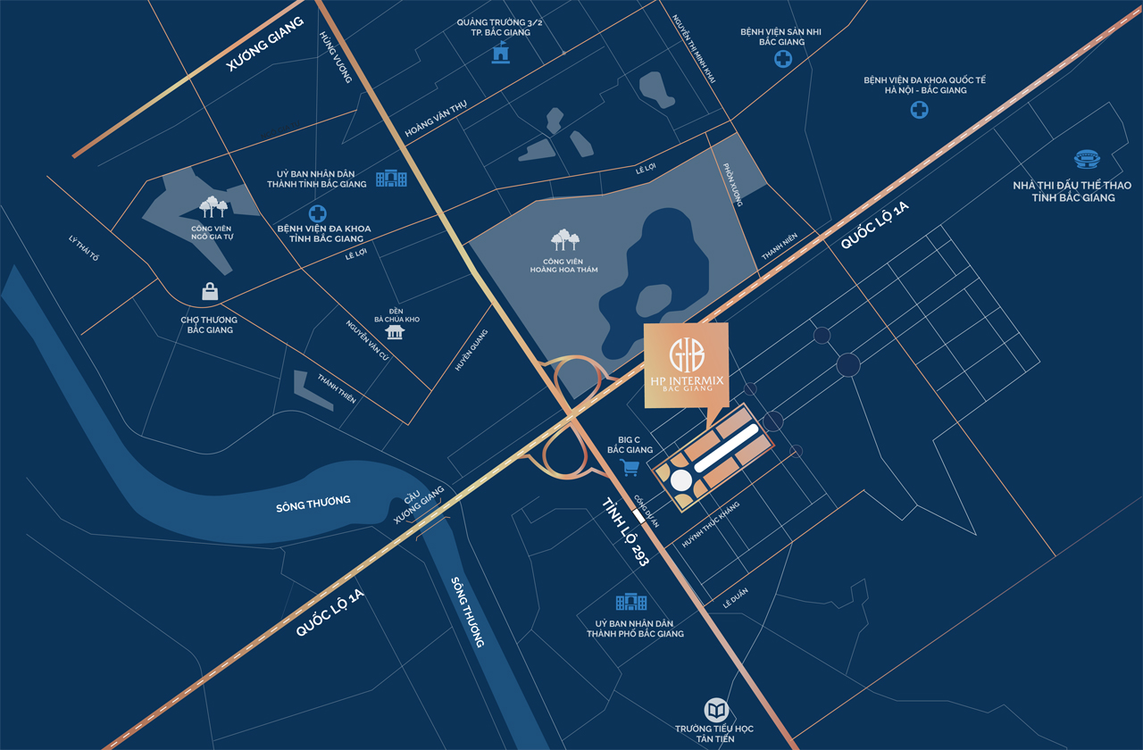 Dự án HP Intermix tọa lạc tại phường Dinh Kế và xã Tân Tiến, thành phố Bắc Giang.Dự án sở hữu tiện ích ngoại khu đắt giá khi nằm ngay cạnh: Công Viên (20ha), Phố Đi Bộ, Trung Tâm Thương Mại Big C, Trung tâm Văn Hóa Cánh Diều,…