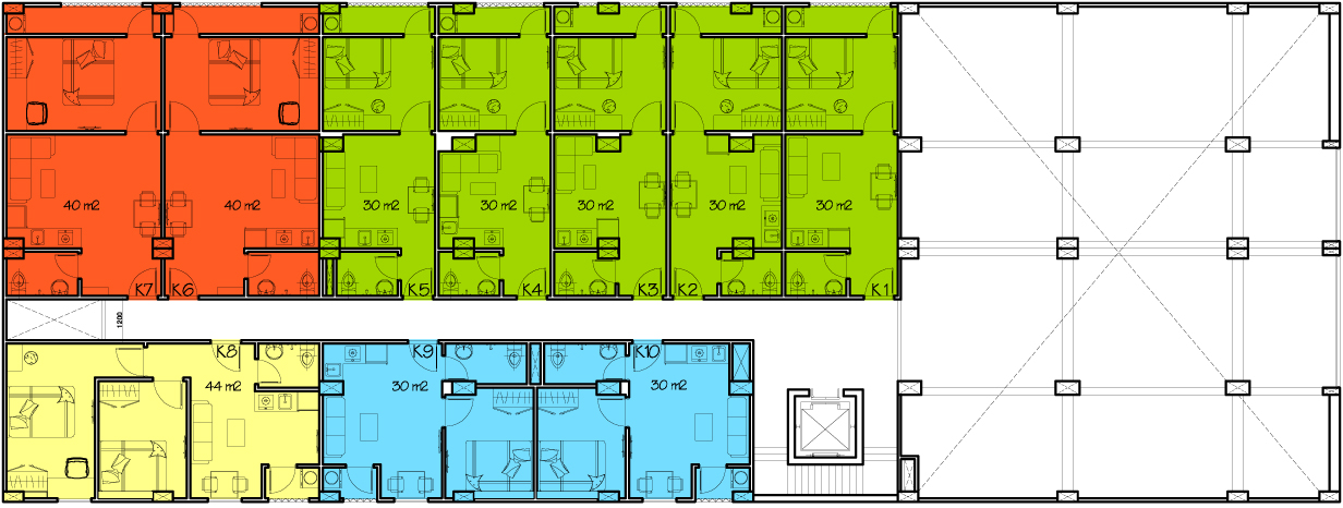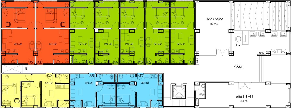 Tầng trệt chung cư K-Home Gò Vấp chỉ có 10 căn hộ có diện tích 30m², 40m² và 1 căn hộ diện tích 44m². Phần diện tích còn lại của tầng trệt K Home là các tiện ích phục vụ cư dân như shophouse, siêu thị mini, thang máy, sảnh đón – tiếp khách, nhà vệ sinh chung…