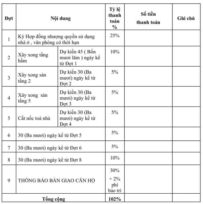 Chiết khấu khi khách hàng thanh toán vượt tiến độ trong đợt 1 |