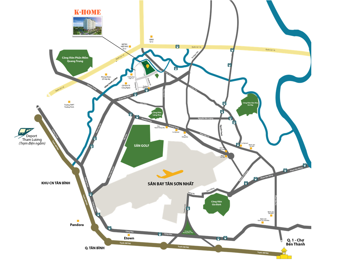 Khu căn hộ mini K-Home cũng tương đối gần Quốc Lộ 1A, nơi giúp cư dân có thể di chuyển sang Quận 12 nhanh chóng, đồng thời cũng có thể đi về khu Đông như Thủ Đức, Bình Dương và khu Tây Bắc như Hóc Môn, Củ Chi, Tây Ninh một cách nhanh chóng.
