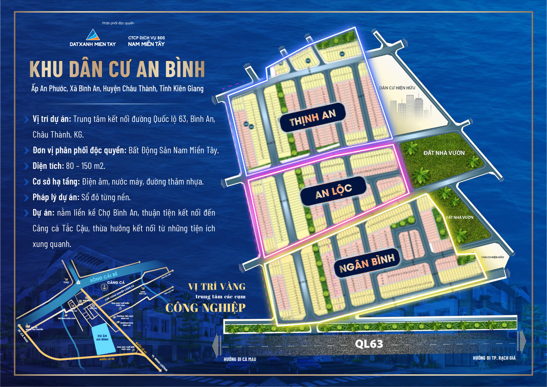 Dự án khu dân cư An Bình tọa lạc tại khu Tắc Cậu, thuộc xã Bình An, huyện Châu Thành, tỉnh Kiên Giang. KDC An Bình tọa lạc ngay trung tâm kết nối đường Quốc Lộ 63, Bình An, Châu Thành, Kiên Giang. Dự án khu dân cư Tắc Cậu nằm ngay chợ Bình An, thuận lợi kết nối đến Cảng cá Tắc Cậu, thừa hưởng kết nối từ những tiện ích xung quanh.