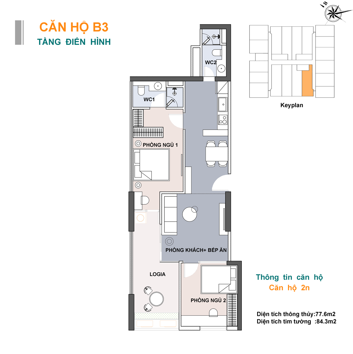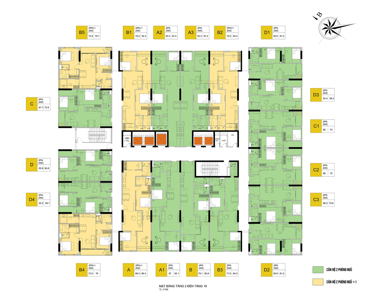 Mỗi tầng căn hộ Lotus 2 bao gồm 19 căn chỉ bao gồm loại 2PN, trong đó:
