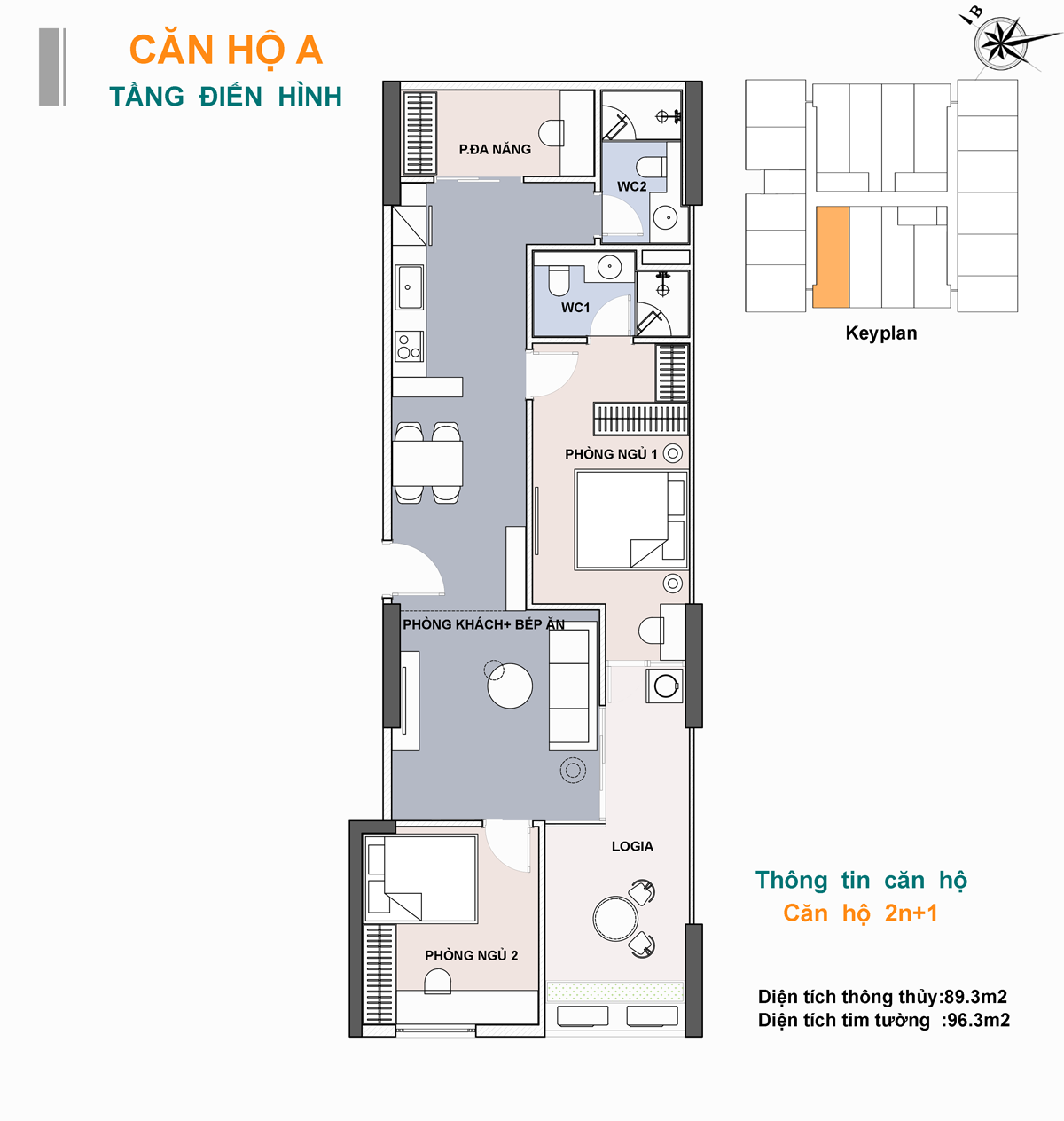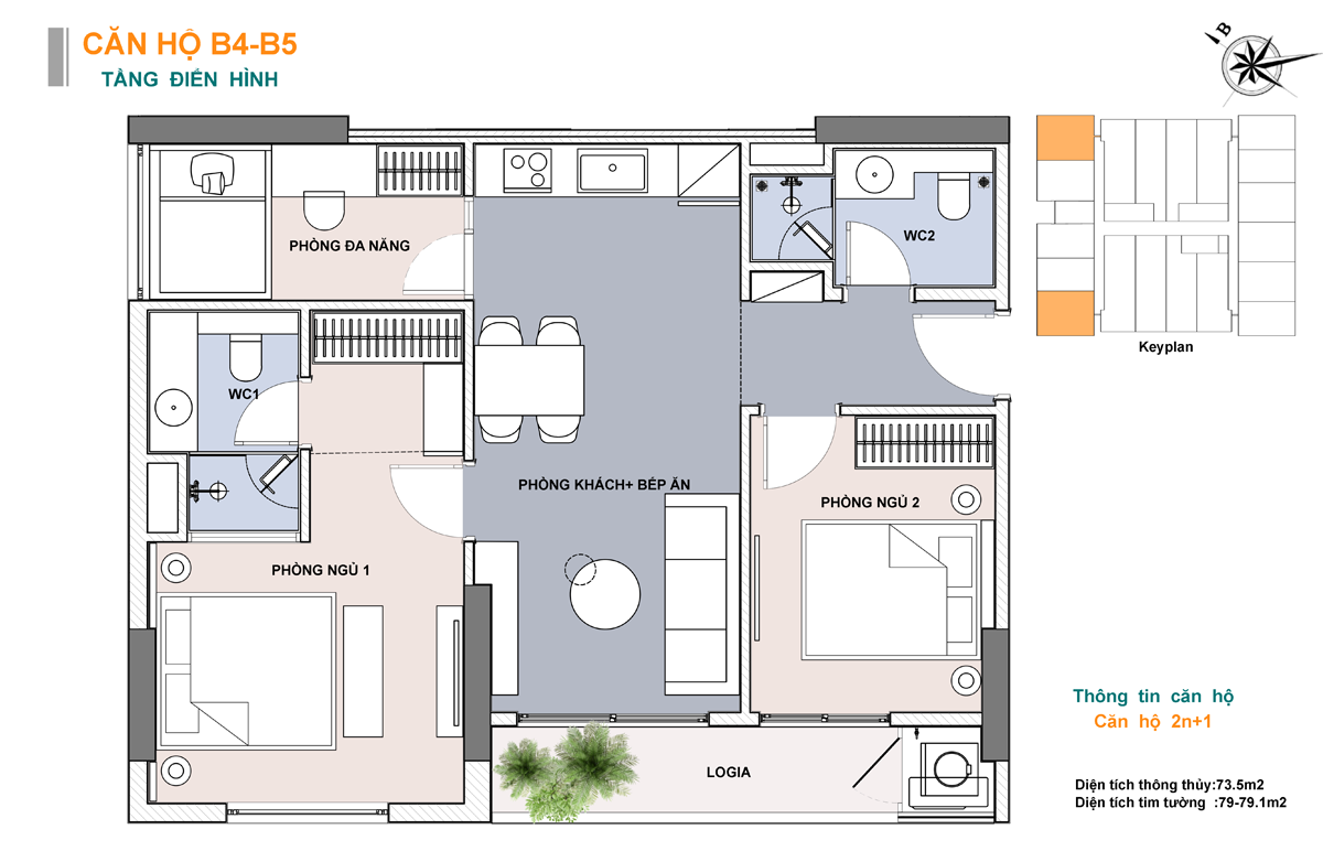 • Căn 2 phòng ngủ + 1: Diện tích từ 79,1m²  – 96,3m²