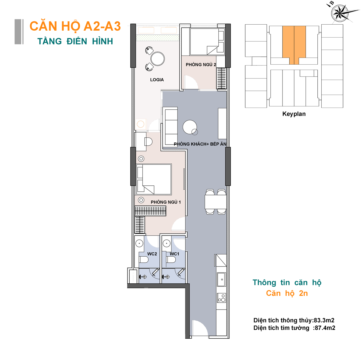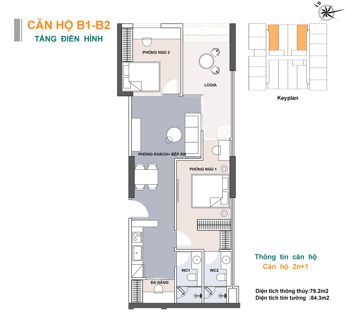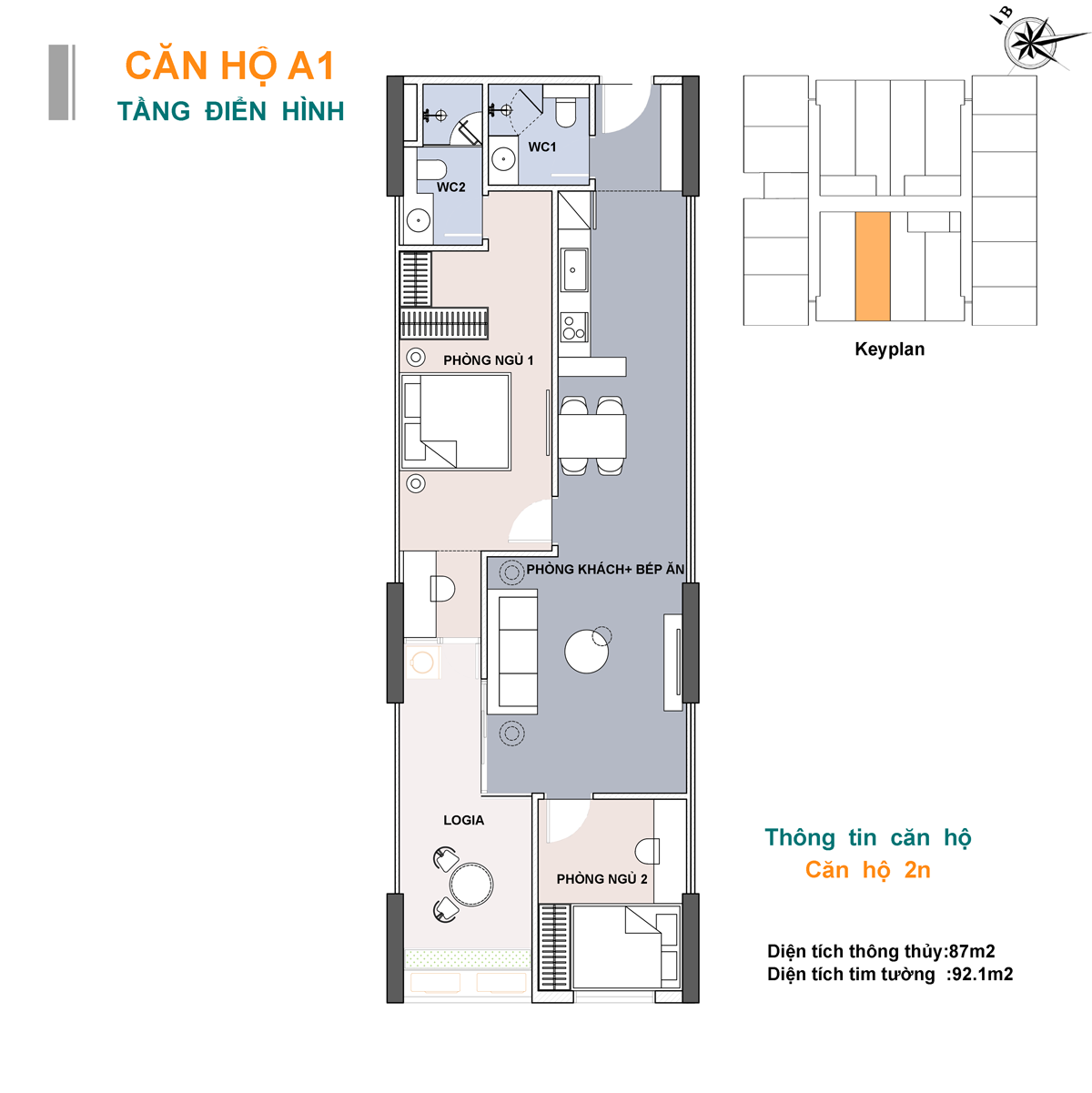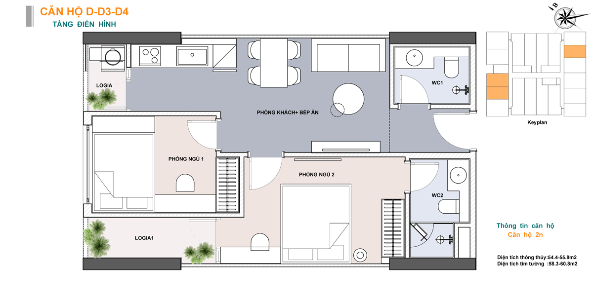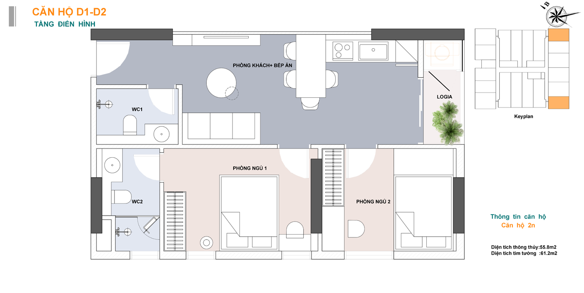 • Căn 2 phòng ngủ : Diện tích từ 60,8m² – 92,1m²