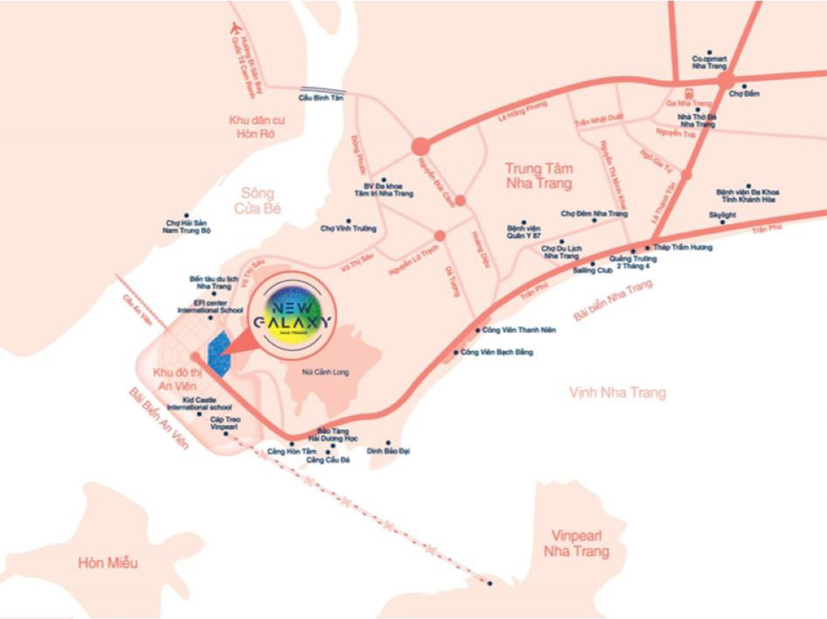 Từ khu đô thị An Viên, cư dân căn hộ New Galaxy Nha Trang có thể đi qua khu dân cư Hòn Rớ – Đại lộ Nguyễn Tất Thành. Đường đi này sẽ giúp rút ngắn gần 10km đường từ sân bay Cam Ranh về thành phố Nha Trang. Điều này cũng sẽ giúp nâng cao vị trí chiến lược của An Viên trong hệ thống đường giao thống mới của Nha Trang.