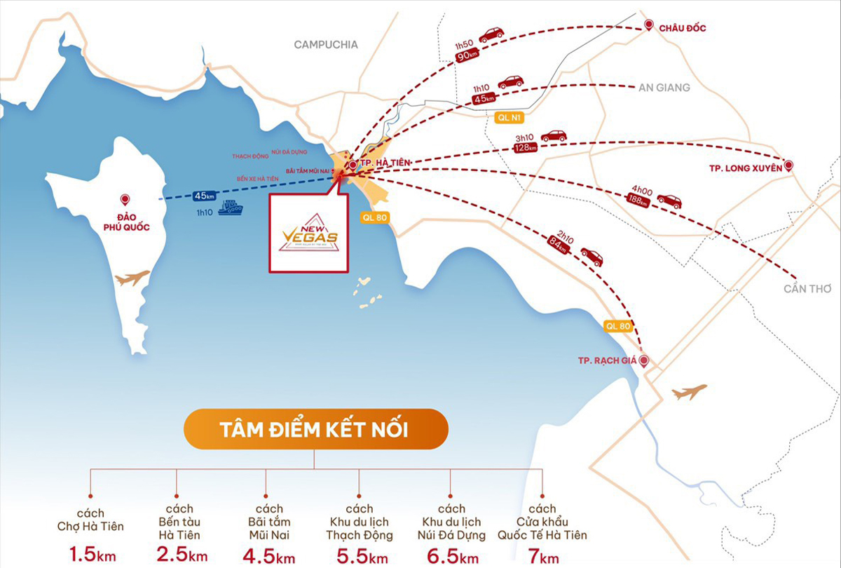 Dự án New Vegas tọa lại tại Đường Số 6, khu phố 2 , phường Pháo Đài, thành phố Hà Tiên. New Vegas chỉ cách chợ Hà Tiên 1.5km, cách bến tàu Hà Tiên 2.5km, cách bãi tắm Mũi Nai 4.5km, cách khu du lịch Thạch Động 5.5km, ách khu du lịch Núi Đá Dựng 6.5km và cách Cửa Khẩu Quốc Tế Hà Tiên 7km.
