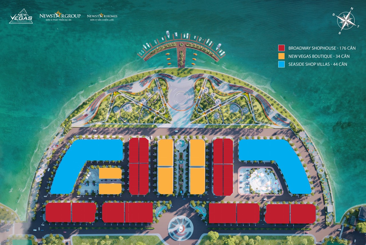 Tổng thể khu đô thị New Vegas Hà Tiên bao gồm 254 sản phẩm trong đó có 176 căn ShopHouse (75 – 170m²), 34 căn Shop Boutique (125 – 296m²) và 44 căn Shop Villas (210 – 318.4m²).