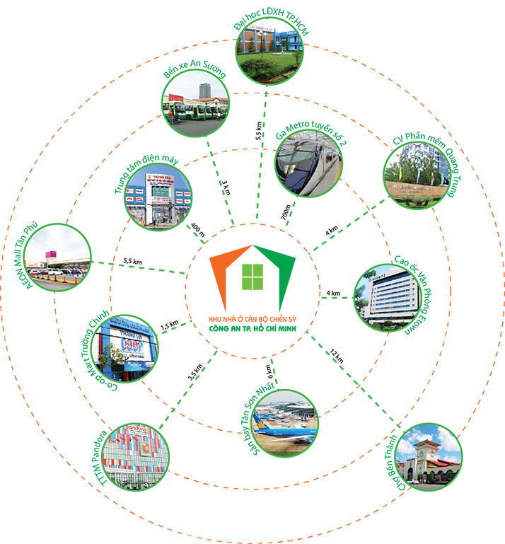 Với vị trí ngon lành nhất quận 12, Khu nhà ở chiến sĩ Công An TP. Hồ Chí Minh kiêm Nhà ở Xã Hội Quận 12 thu hưởng mọi tiện ích bậc nhất của cả 3 quận 12, Tân Bình, Tân Phú, đặc biệt dự án chỉ cách Sân Bay Tân Sơn Nhất 20 phút, cách tuyến metro số 2 Bến Thành – Tham Lương (gần Stown Tham Lương Quận 12) chỉ 5 phút di chuyển.