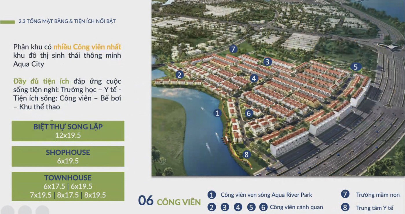 Phân khu dự án River Park 1 Aqua City được phân thành 3 cụm theo 3 dạng sản phẩm: nhà phố, biệt thự, shophouse. Dãy shophouse được bố trí ngay mặt tiền đường Hương Lộ 2, khu biệt thự được bố trí ven sông còn khu nhà phố được thiết kế phía trong.