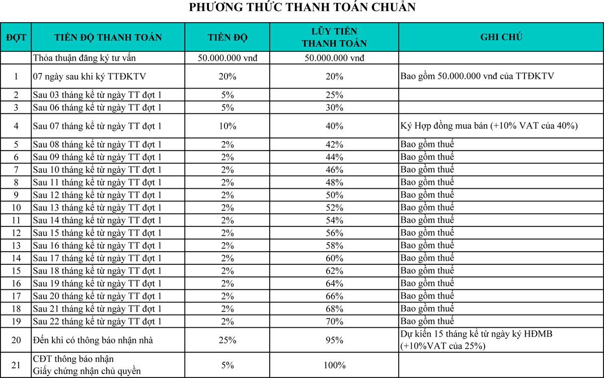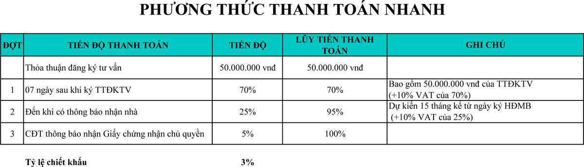 Khách hàng mua nhà phố Sala Phú Mỹ khi thanh toán theo phương thức thanh toán nhanh sẽ được nhận chiết khấu 3% trên tổng giá trị hợp đồng (chưa VAT). Ngoài ra, khách hàng còn nhận thêm chiết khấu 1% khi nằm trong vị trí 80 booking đầu tiên của mở bán đầu tiên.
