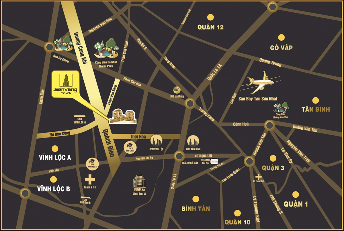 Dự án Sen Vàng Town tọa lạc ngay mặt tiền đường Quách Điêu thuộc xã Vĩnh Lộc A, huyện Bình Chánh. Khu phố thương mại Sen Vàng nằm đối diện Cửa Hàng Điện Máy Xanh, gần chợ Nữ Dân Công, cách giao lộ Vĩnh Lộc – Nguyễn Thị Tú chỉ hơn 1 km. Đây là vị trí tiếp giáp với địa bàn Vĩnh Lộc B, nơi rất thuận tiện để di chuyển về quận Tân Phú qua tuyến đường Nguyễn Thị Tú.