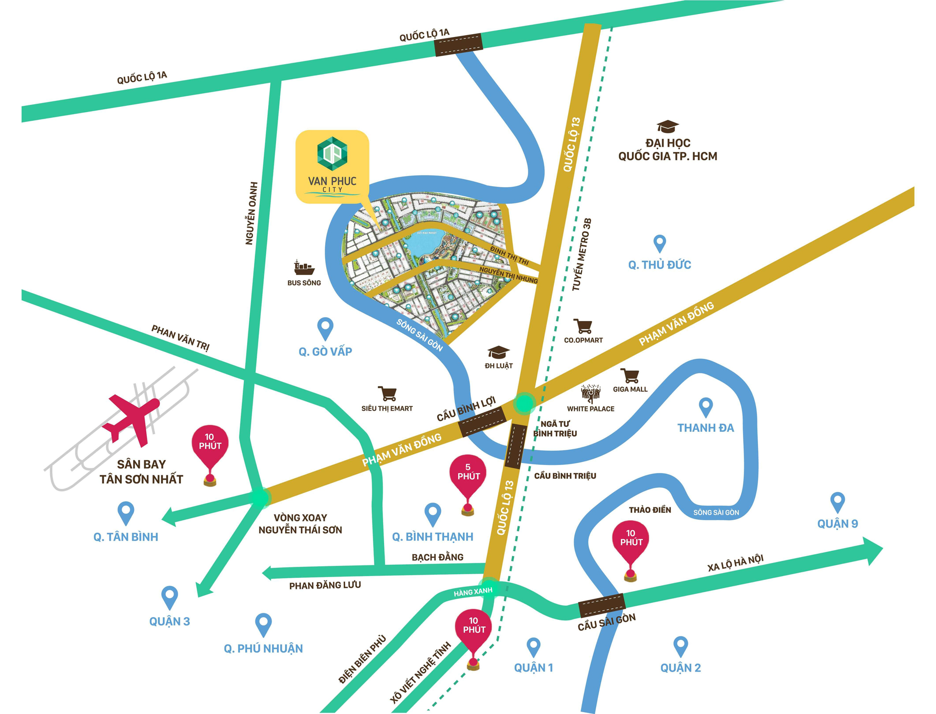 Khu đô thị Vạn Phúc City tọa lạc ngay mặt tiền Quốc Lộ 13, thuộc phường Hiệp Bình Phước, quận Thủ Đức. Vị trí này của Vạn Phúc City cho đến nay không còn quá xa lạ vì dự án có mặt tiền rộng lớn, tọa lạc ngay tuyến đường cửa ngõ từ Bình Dương vào trung tâm thành phố Hồ Chí Minh.