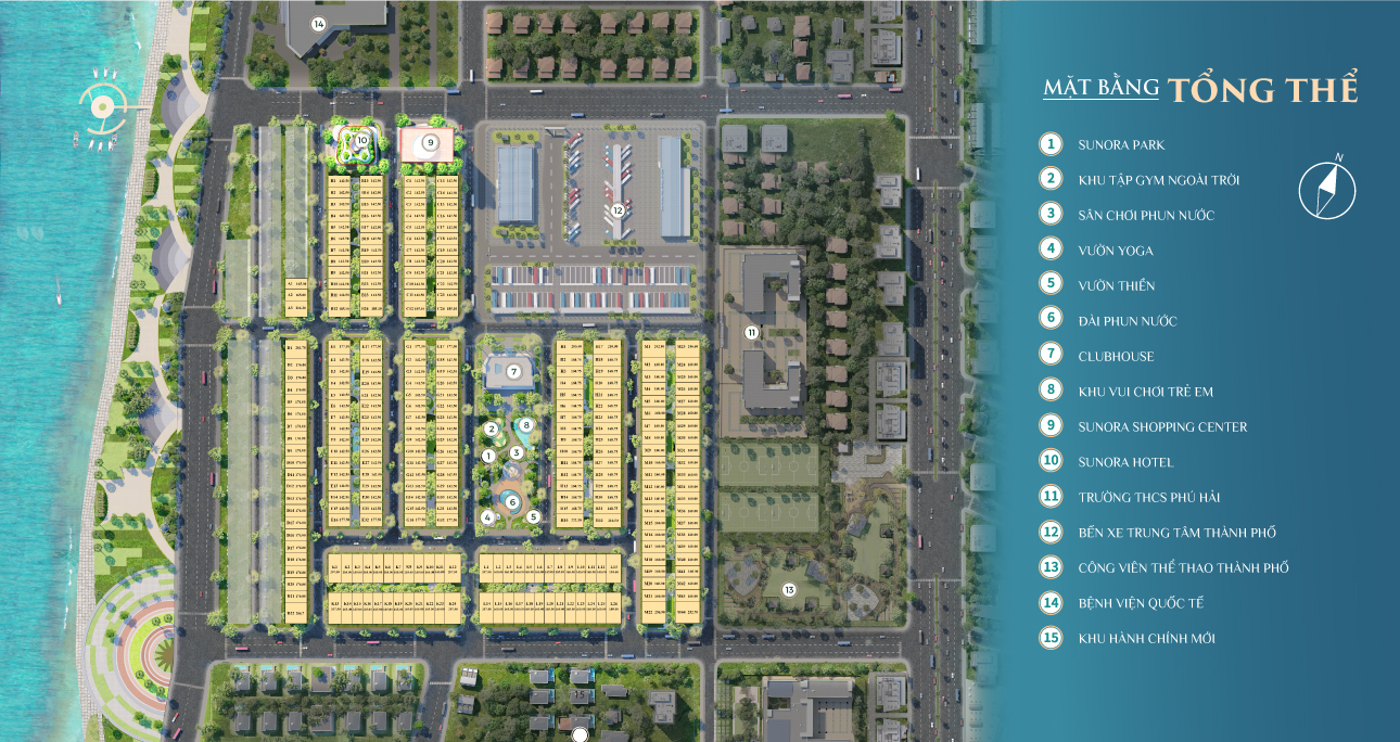 1. Sunora Park 2. Khu tập gym ngoài trời 3. Sân chơi phun nước 4. Vườn Yoga 5. Vườn thiền 6. Đài phun nước 7. Clubhouse 8. Khu vui chơi trẻ em 9. Sunora Shoping Center 10. Sunora Hotel 11. Trường THCS Phú Hải 12. Bến xe trung tâm thành phố 13. Công viên thể thao 14. Bệnh viện quốc tế 15. Trung tâm hành chính.