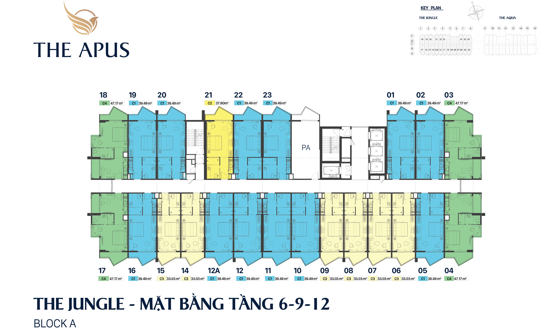 Mỗi tầng căn hộ của Tháp Jungle có 24 căn hộ diện tích tương đối nhỏ (33 – 47 m²) phù hợp với loại hình căn hộ du lịch, vui chơi, nghỉ dưỡng. Dù diện tích tương đối nhỏ nhưng về tổng thể các căn hộ The Apus Phước Hải có thiết kế thoáng, tối ưu hóa không gian để đón nhận nắng – gió từ đại dương bao la.